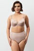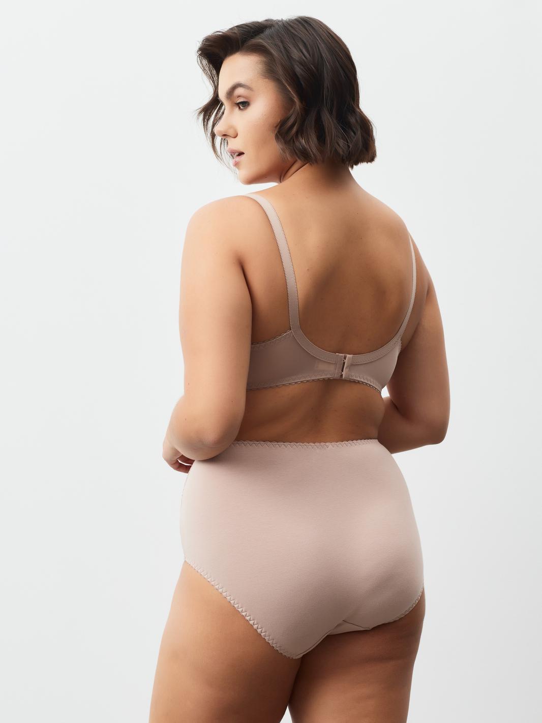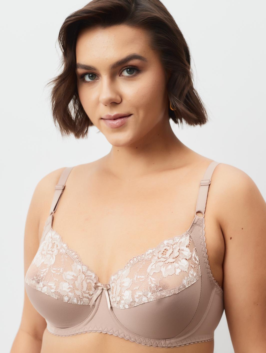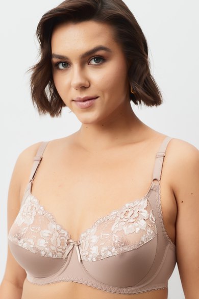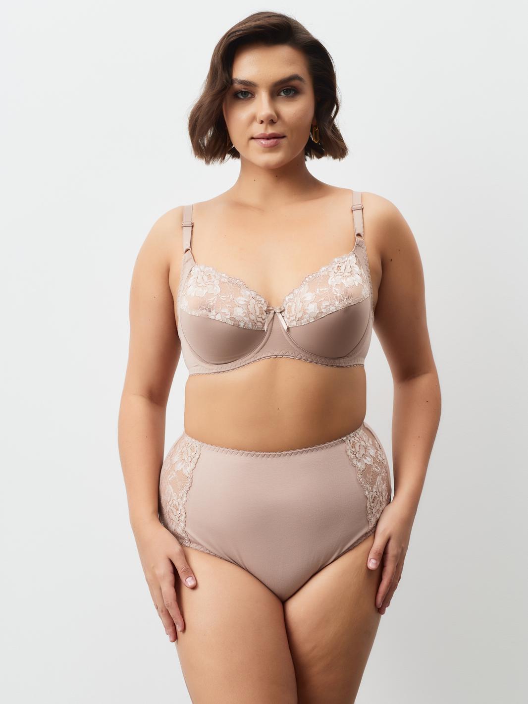Бюстгальтер с мягкой чашкой, выполненный из эластичного трикотажного полотна и декорированный эластичным кружевом в верхней части чашки. Есть боковая поддерживающая деталь, обеспечивающая дополнительное приподнимание груди. В модели присутствуют каркасы (косточки). Бретели регулируются по длине. Ширина бретелей увеличивается пропорционально увеличению размера (1,0 см, 1,5 см, 2,0 см, 2,5 см). В самых маленьких размерах застежка на 1 крючок из двух позиций, в большинстве размеров застежка на 2 крючка из трех позиций; в больших размерах на 3 крючка с выбором из трех позиций.