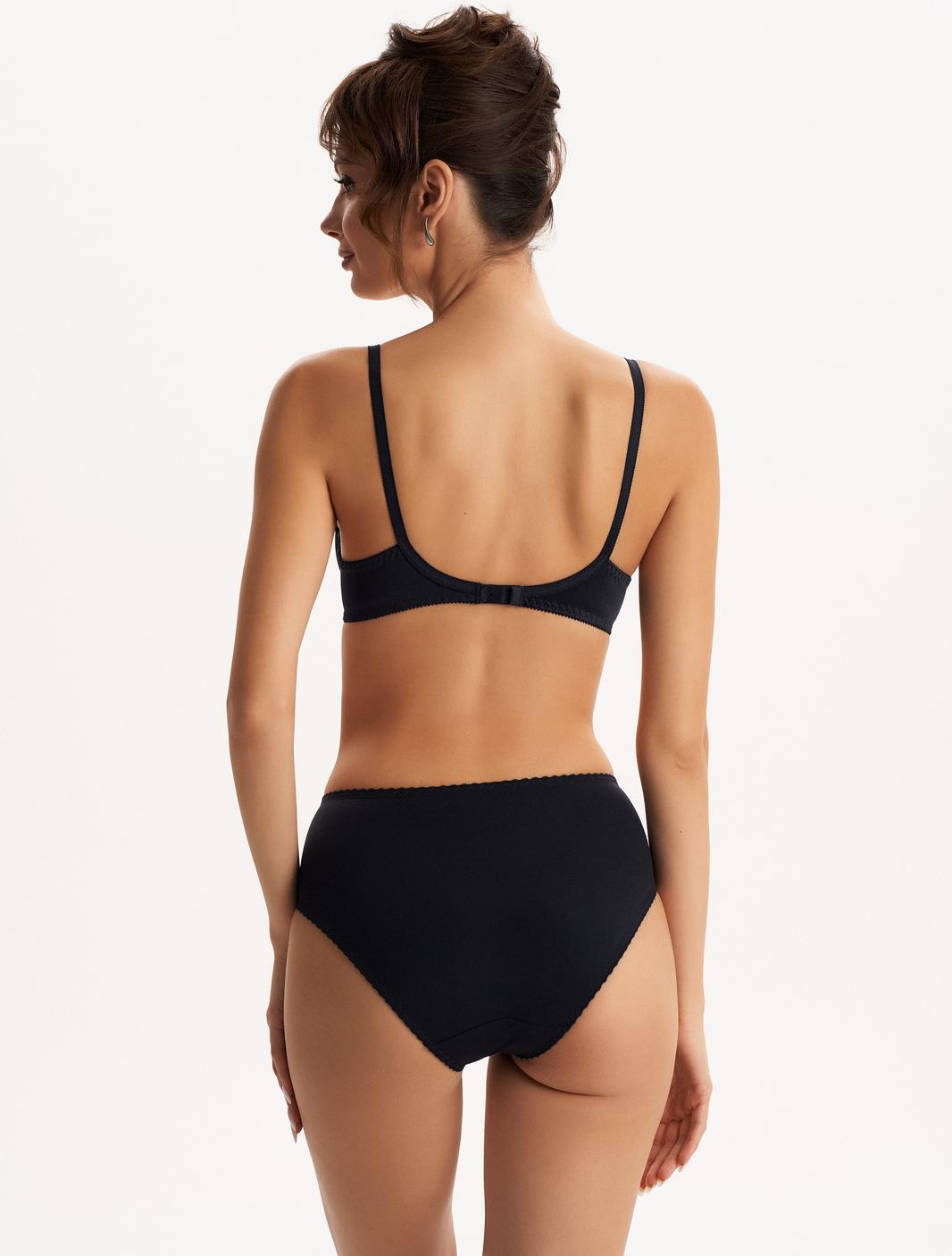 Бюстгальтер с мягкой чашкой, выполненный из эластичного трикотажного полотна и декорированный вышивкой. Есть боковая поддерживающая деталь, обеспечивающая дополнительное приподнимание груди. В модели присутствуют каркасы (косточки). Бретели регулируются по длине. Ширина бретелей увеличивается пропорционально увеличению размера (1,0 см, 1,5 см, 2,0 см, 2,5 см).