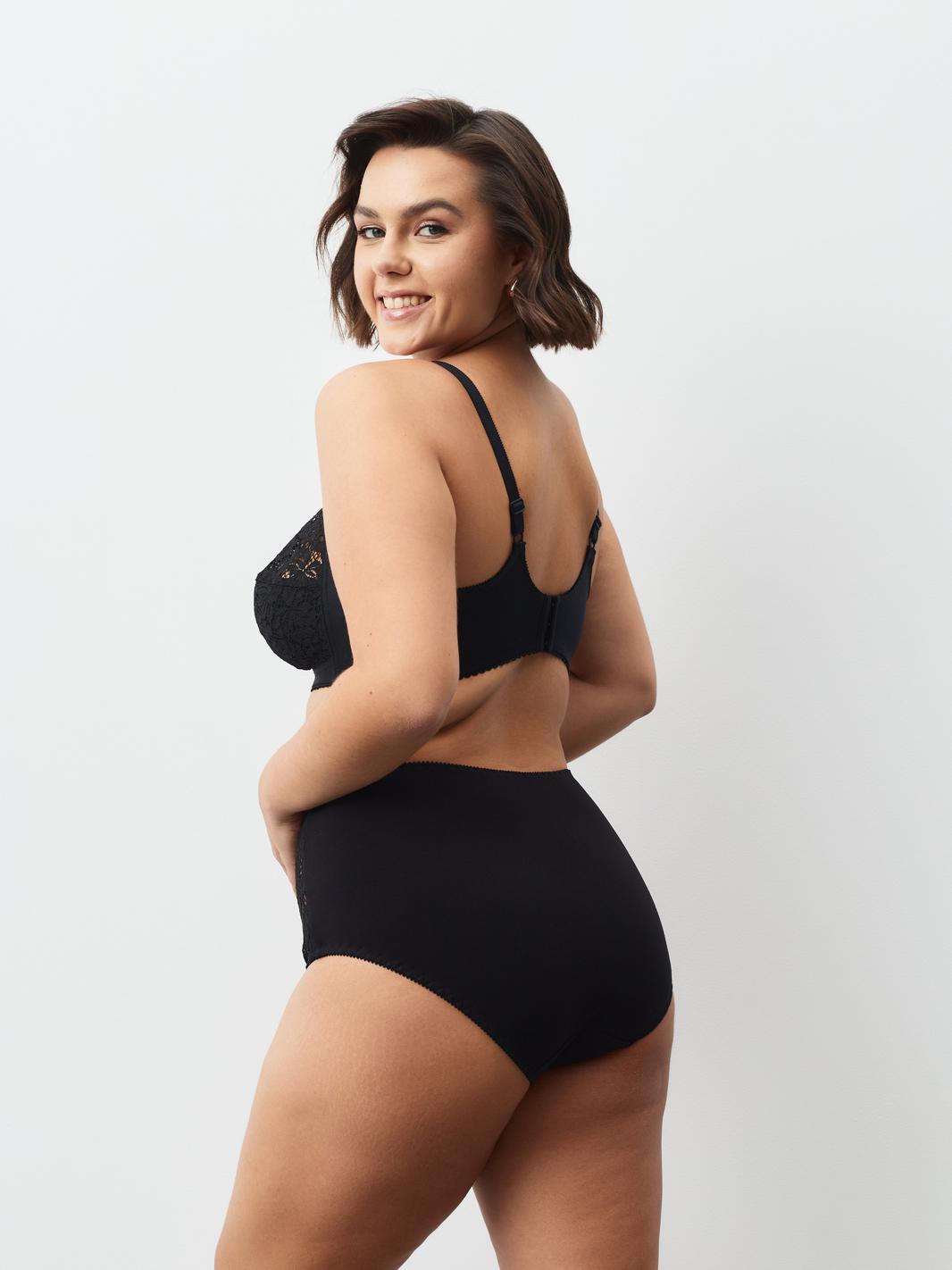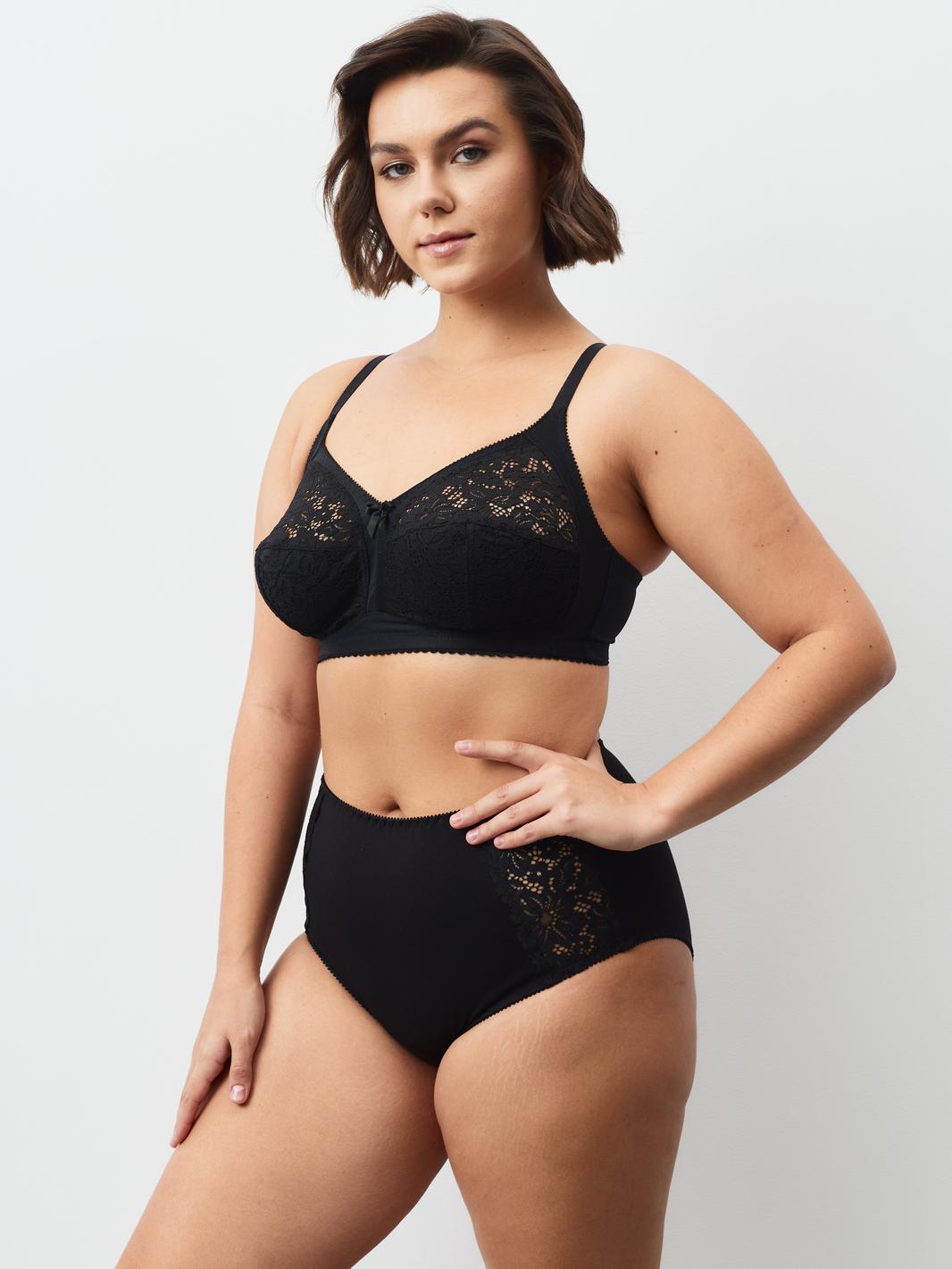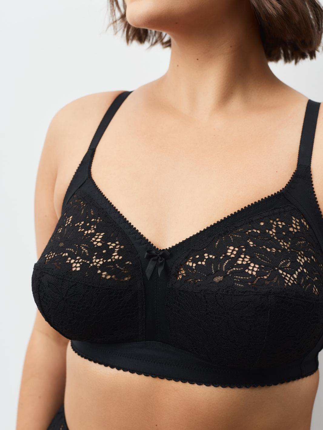 Бюстгальтер бескаркасный, декорированный кружевом по всей чашке, внутри чашки - вставка из хлопка, которая приятна к телу и не вызовет раздражения. Боковая деталь, широкие бретели и бочки обеспечивают отличную поддержку, а также равномерно распределяют вес груди, что крайне важно, особенно при очень больших размерах. Модель идеально подойдёт для повседневной носки.