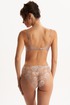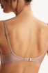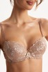 Бюстгальтер из эластичного кружева и эластичного трикотажного полотна (микрофибра) с глубокими формованными чашками без эффекта («пуш-ап»). В модели присутствуют каркасы («косточки»). Бочки из эластичного трикотажного полотна (микрофибра), наполовину кружевные. Бретель скомбинирована с ажурной.