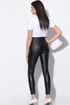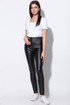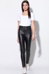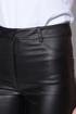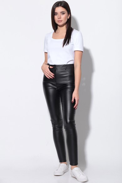 Брюки из ткани под кожу. По задним половинкам кокетка и накладные функциональные карманы. По передним половинкам имитация кармана. Пояс со шлевками выполнен из основной ткани застегивающийся на петлю и пуговицу.