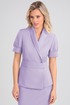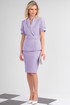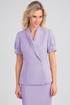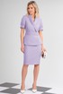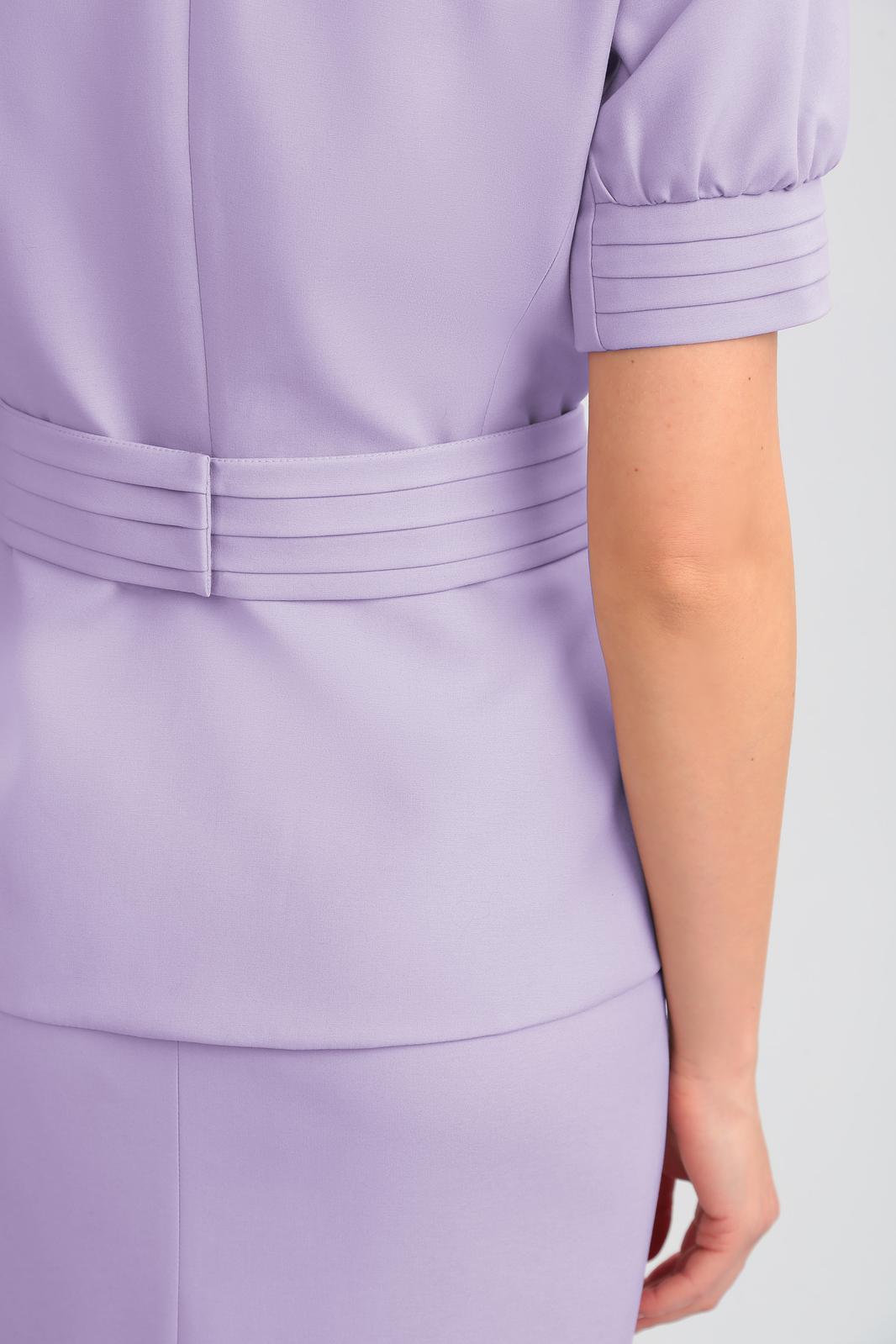 Комплект состоящий из жакета и юбки. Жакет приталенного силуэта, втачного покроя, на подкладке. По переду и спинке подрез по линии талии, и рельефы из проймы до подреза талии. Воротник типа шаль. Застежка смещенная застегивающаяся на потайные кнопки. Рукав одношовный, короткий, с манжетой по низу. На манжете вставка с 3-мя односторонними складками. По низу рукава от манжеты, сборка. В комплект к жакету идет пояс выполненный из основной ткани в цвет костюма. На поясе выполнены декоративные застрочные складки, как на манжетах рукава. Пояс фиксируется на потайные крючки.