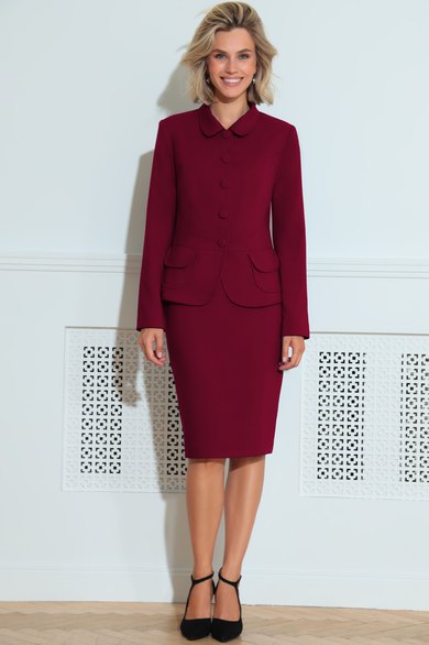 Комплект, состоящий из жакета и юбки. Жакет полуприлегающего силуэта на подкладке с рельефами по переду и спинке, с отрезным поясом по талии и накладными карманами с клапаном. Рукав втачной двухшовный длинный, воротник стояче-отложной. Застежка центральная бортовая на обтяжные пуговицы. Юбка на подкладке, зауженная к низу с притачным поясом и на резинке в размерах 50-54. Застежка в юбке на потайную тесьму-молнию в среднем шве заднего полотнища и шлицей.