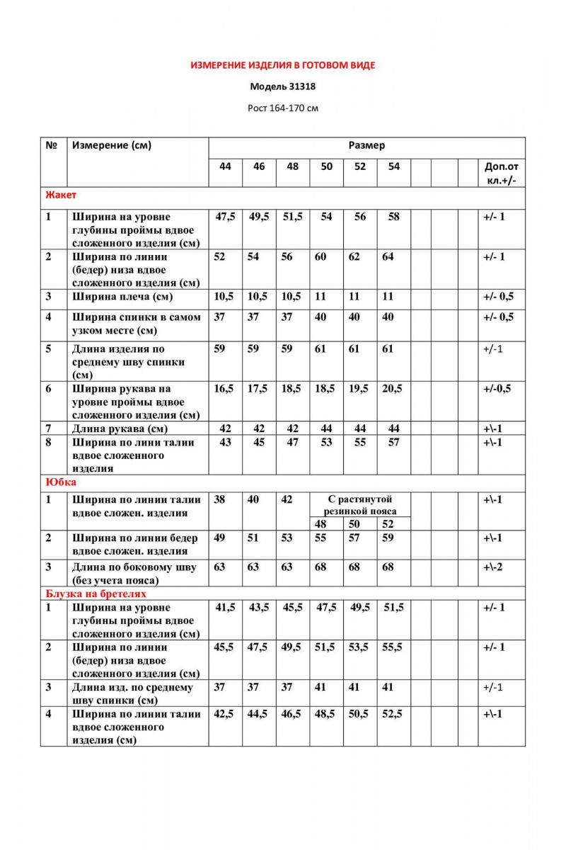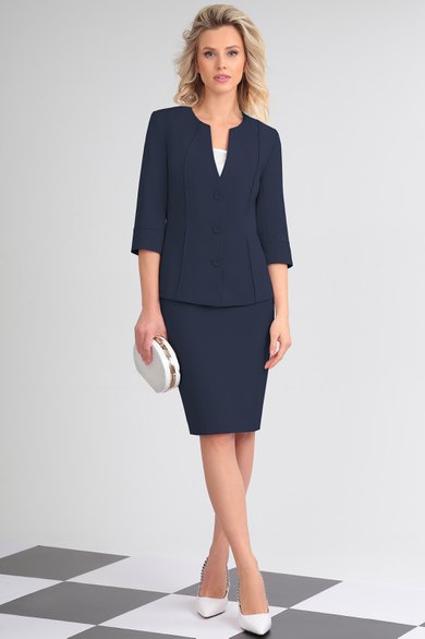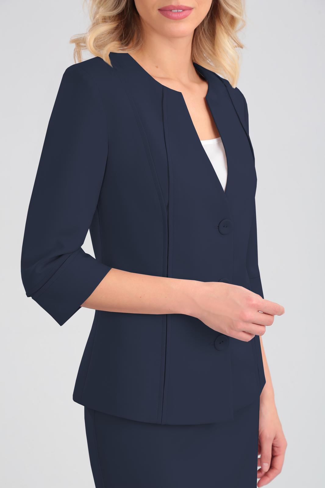 Комплект женский состоящий из жакета, юбки и трикотажного топа. Жакет на подкладке, приталенного силуэта, втачного покроя. По переду фигурные рельефы в виде встречных защипов. Спинка со средним швом и вертикальными рельефами из проймы. Вырез горловины фигурный. Застежка центральная бортовая на 3 обтяжные пуговицы и петли. Рукав двухшовный длиной ниже линии локтя с манжетой по низу, шов манжеты рукава оформлен встречными защипами.