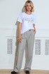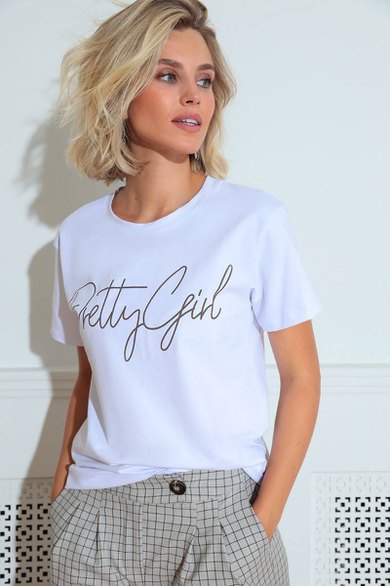 Блузка(футболка) прямого силуэта со спущенной линией плеча. Рукав втачной одношовный короткий. Вырез горловины с притачной планкой из основной ткани. По переду декоративный принт (печать).