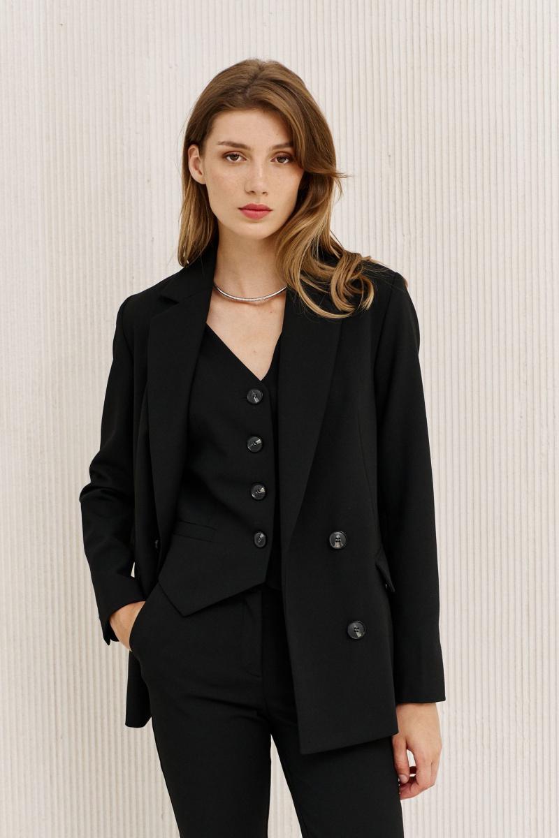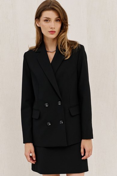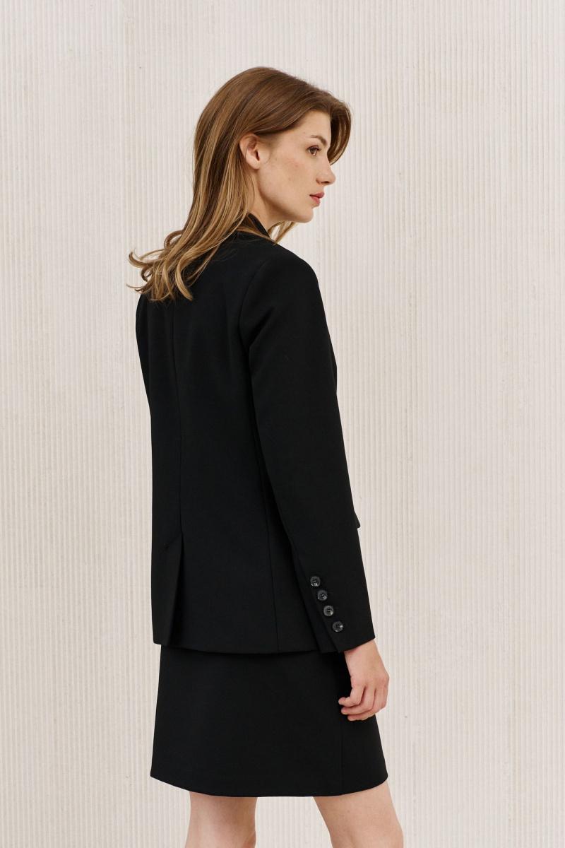 Жакет полуприлегающего силуэта на подкладке. Перед с декоративными вытачками, отрезным бочком и прорезными функциональными карманами с клапаном. Спинка со средним швом, в среднем шве щлица. Воротник пиджачного типа. Застежка двубортная застегивающаяся на 4 декоративных пуговицы. Рукав длинный втачной со шлицей и с 4-мя декоративными пуговицами.