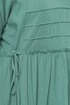 Платье женское, отрезное по линии таклии, свободного силуэта, покроя типа кимоно. Длина рукава короткая. Перед ассиметричный, по правой стороне вертикальный рельеф из проймы, по левой стороне платья горизонтальные защипы шириной 0.5 см. Вырез горловины V-образный скругленный с притачной планкой. По низу рукава притачная манжета. По верхней части спинки вертикальные защипы раствором 0.5 см. В нижней части платья сборка, соединение настрочным швом создает декоративную рюшу. В боковых швах расположены функциональные карманы. По правому боку платья вставлены декоративные пояски -рукики.