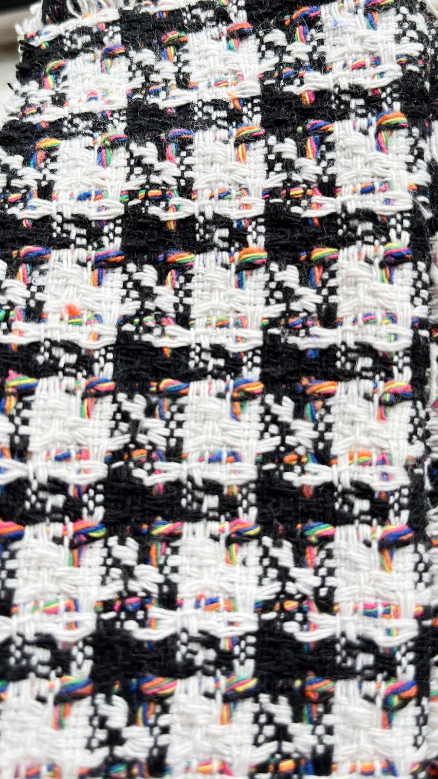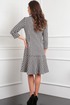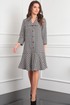 Платье полуприлегающего силуэта, втачного покроя. По переду нагрудная вытачка, по спинке талиевые вытачки. По низу широкий волан. Рукав втачного покроя, длина 3/4. Застежка централь-бортовая на петли и пуговицы до линии притачивания волана. Вороник апаш. Платье выполнено из рогожки с очень оригинальным плетением с добавлением разноцветной нити.