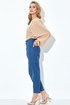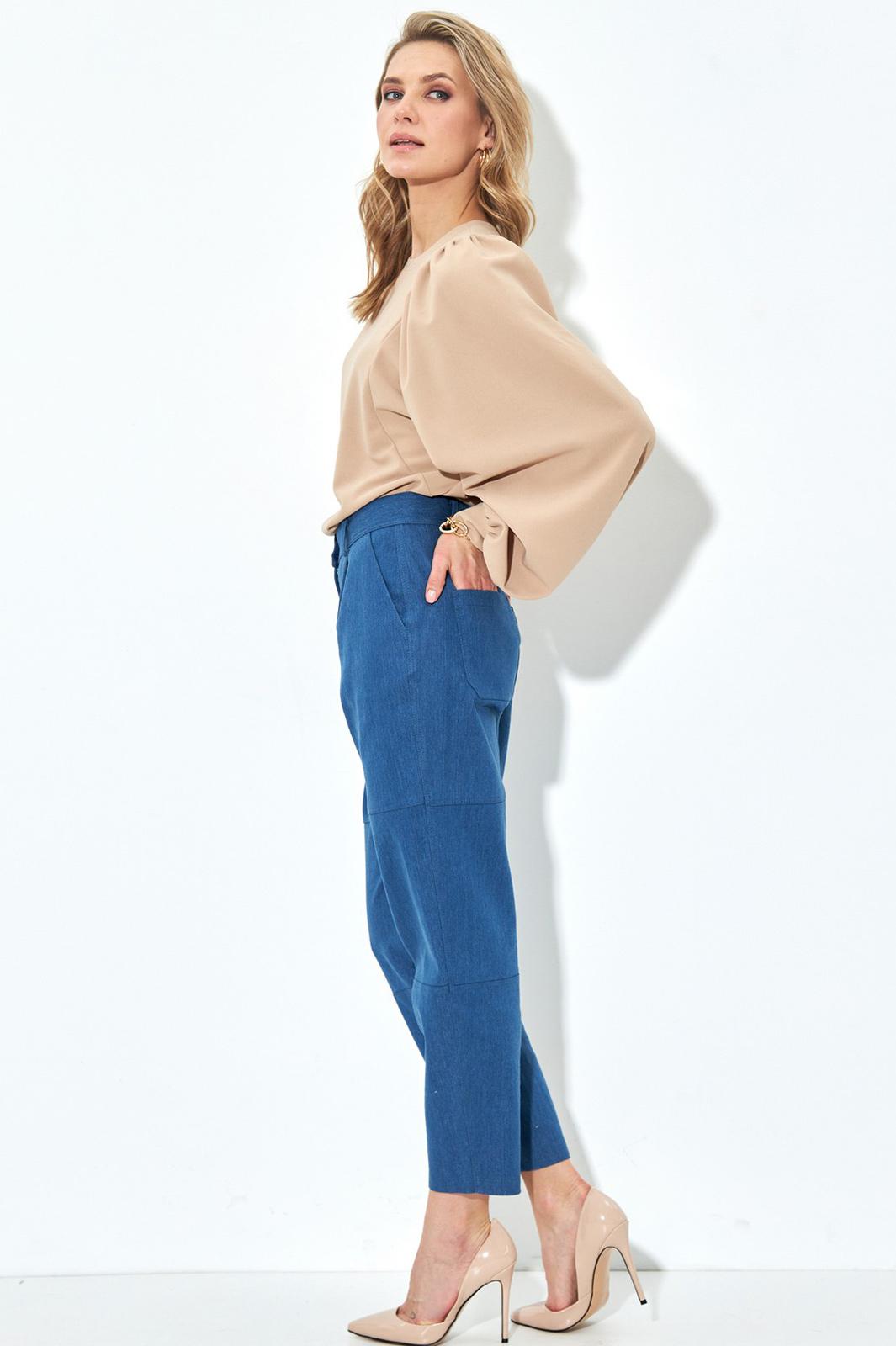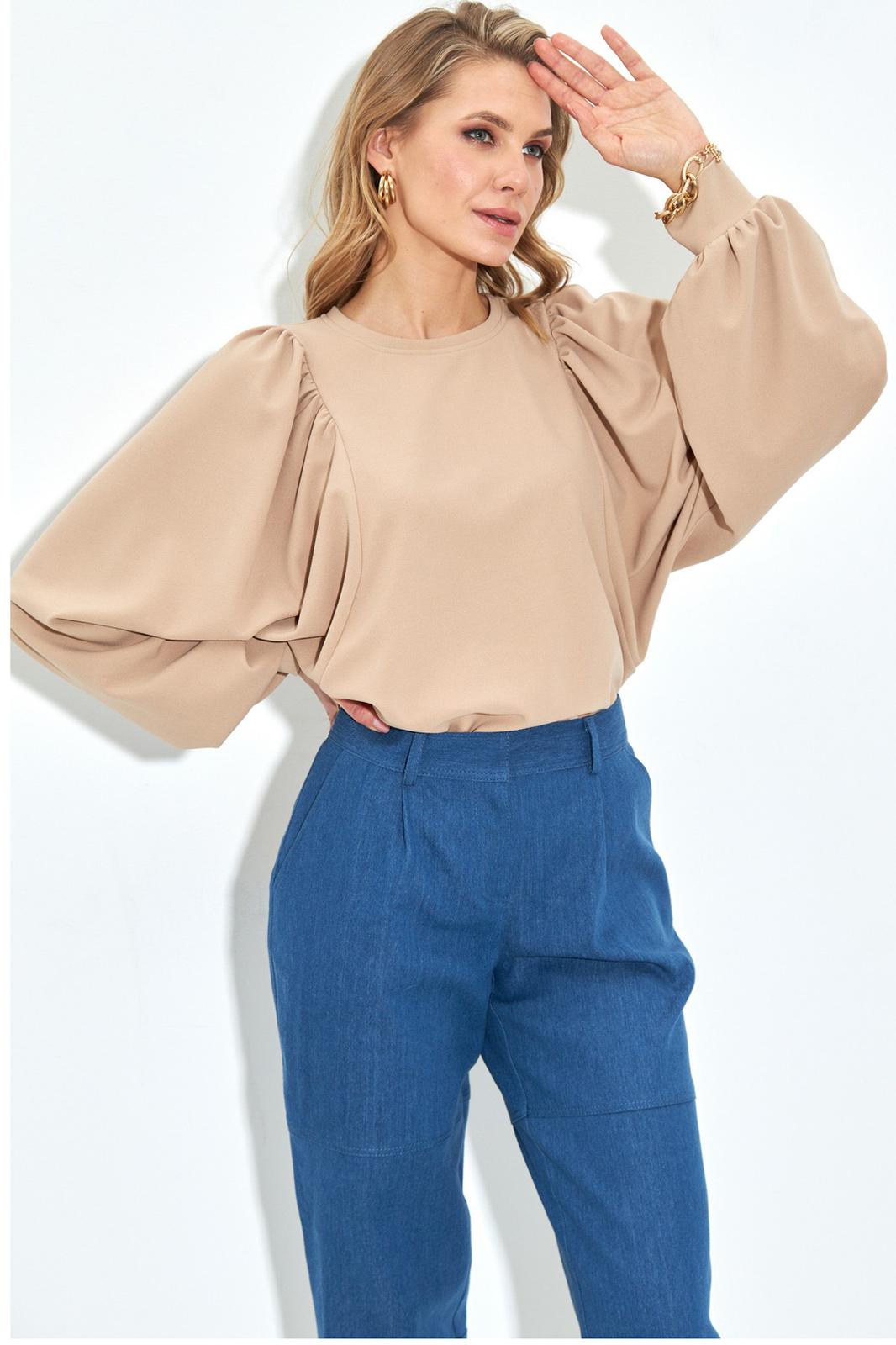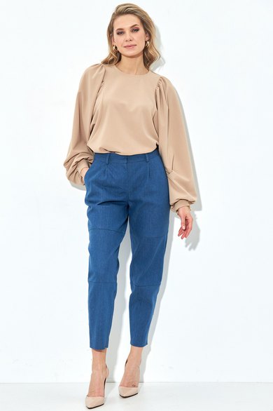 Объемный джемпер песочного цвета. Круглый вырез горловины, рукав с манжетам и оборками. Джинсы зауженные к низу. Карманы с наклонным входом, застежка на молнию и пуговицы.