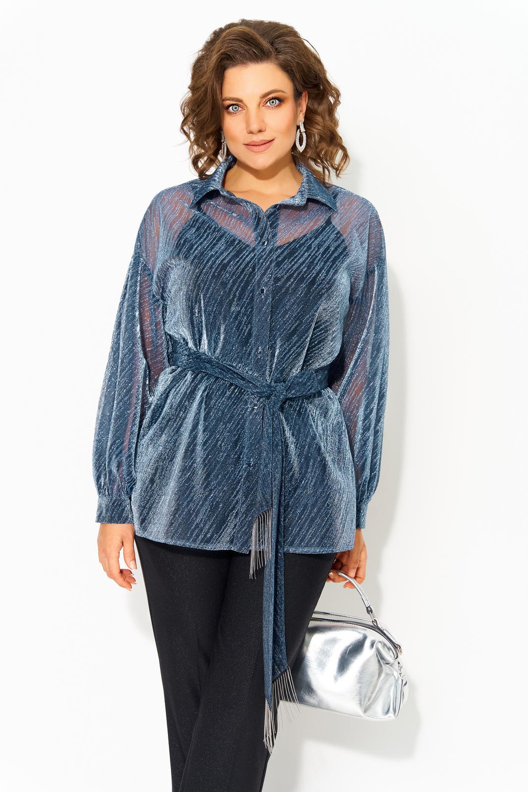 Трендовая блузка из легкой сетчатой ткани c эффектом мерцания станет стильным дополнением вашего гардероба. Ее можно комбинировать с различными элементами гардероба, накинуть поверх платья или топа. Модель выполнена с воротником-стойкой, который добавляет элегантности образу. Застежка центральная на петли и пуговицы. По бокам расположены разрезы. Свободный крой обеспечивает комфорт и подчеркивает женственность. Длинный рукав с манжетами делает ее универсальной для любого сезона, а удлиненный силуэт добавляет изысканности. В комплект входит съёмный пояс с декоративной бахромой, который может служить в виде шарфика и добавить элегантность образу.
