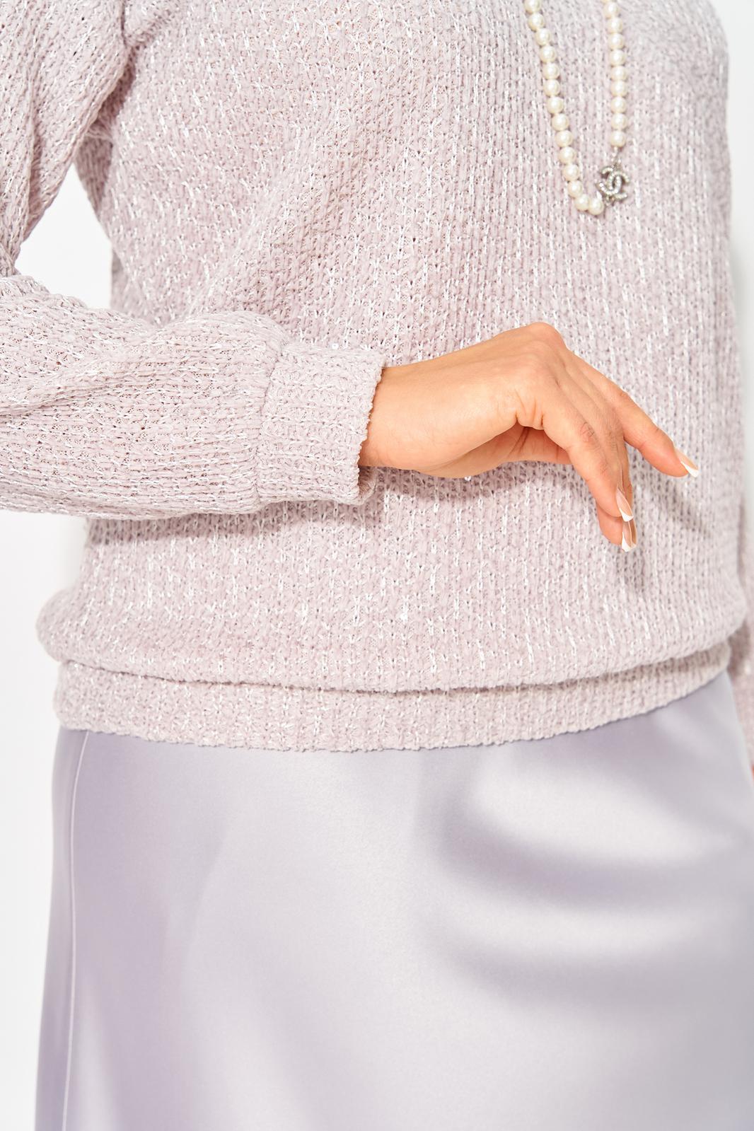 Вязанный жемчужно-лиловый джемпер с ажуром по вороту - это идеальный вариант для создания стильного и привлекательного романтического образа! Мягкий и нежный материал этого джемпера делает его очень приятным на ощупь, теплым и уютным, а легкое мерцание придает свою изюминку. Горловина v-образной формы приковывает взгляды к линии декольте. Рукав длинный, на спущенной линии плеча. Низ рукава, а также низ изделия оформлен мягкой трикотажной манжетой. Особенно актуальна данная кофточка на осенний и зимний период, за счет качественного состава, не пропускает холод обеспечивает тепло и комфорт!