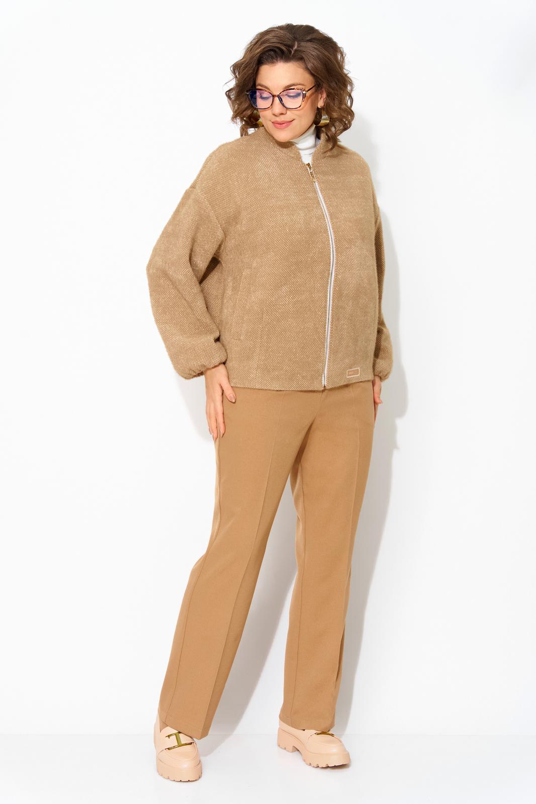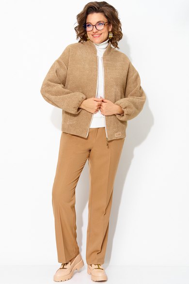 Классические женские брюки, со средней посадкой, прямого покроя от бедра. Застежка – брючная тесьма-молния с обработанным гульфиком. Карманы боковые. Пояс притачной, в боковых участках вставлена резинка на свободу. По переду заутюжены канты. Спинка с Талиевыми выточками. Подгибка брюк –– 4 см.