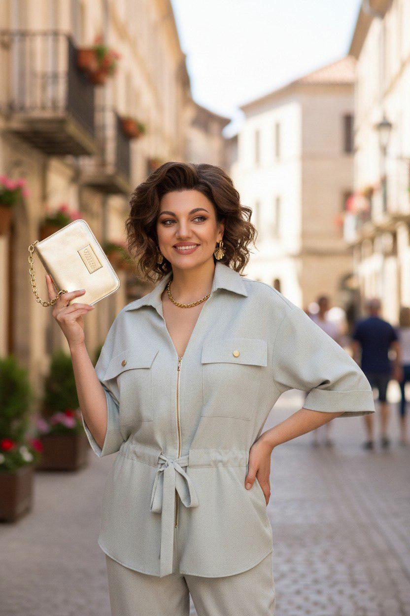 Эффектный женский костюм с брюками палаццо и свободным блузоном - это воплощение комфорта и актуального стиля! Модель выполнена из качественного легкого вискозного материала, с добавлением льна. Модный блузон-жакет с коротким рукавом, дополнен металлической молнией и стильными накладными карманами с клапаном. V-образный вырез горловины оформлен отложным воротником. Регулируемая кулиска с поясом-завязкой позволяет акцентировать внимание на талии или оставить силуэт более свободным. Брюки палаццо с широкими штанинами и высокой посадкой с боковыми карманами. Мягкая круговая резинка на поясе обеспечивает идеальное прилегание, не сковывая движений. Этот костюм-двойка — настоящий тренд, вдохновленный эстетикой pinterest (пинтерест). Блузон – 70 см, рукав – 40%.