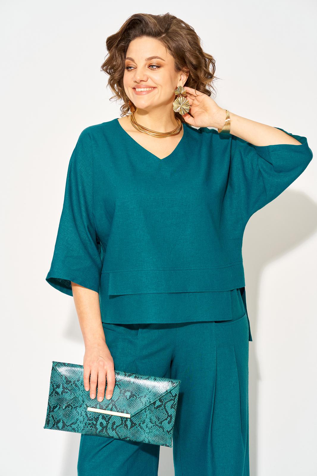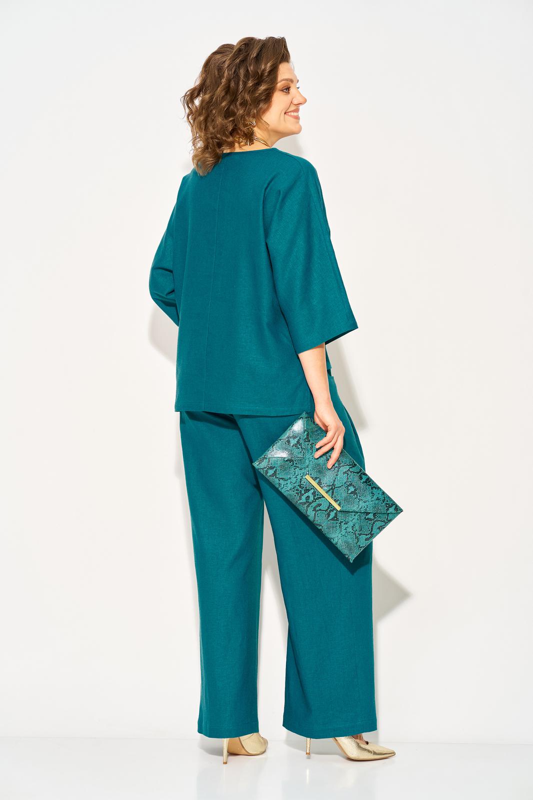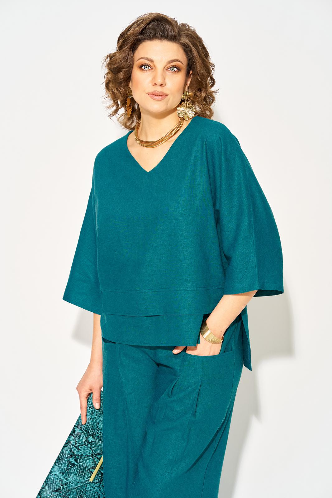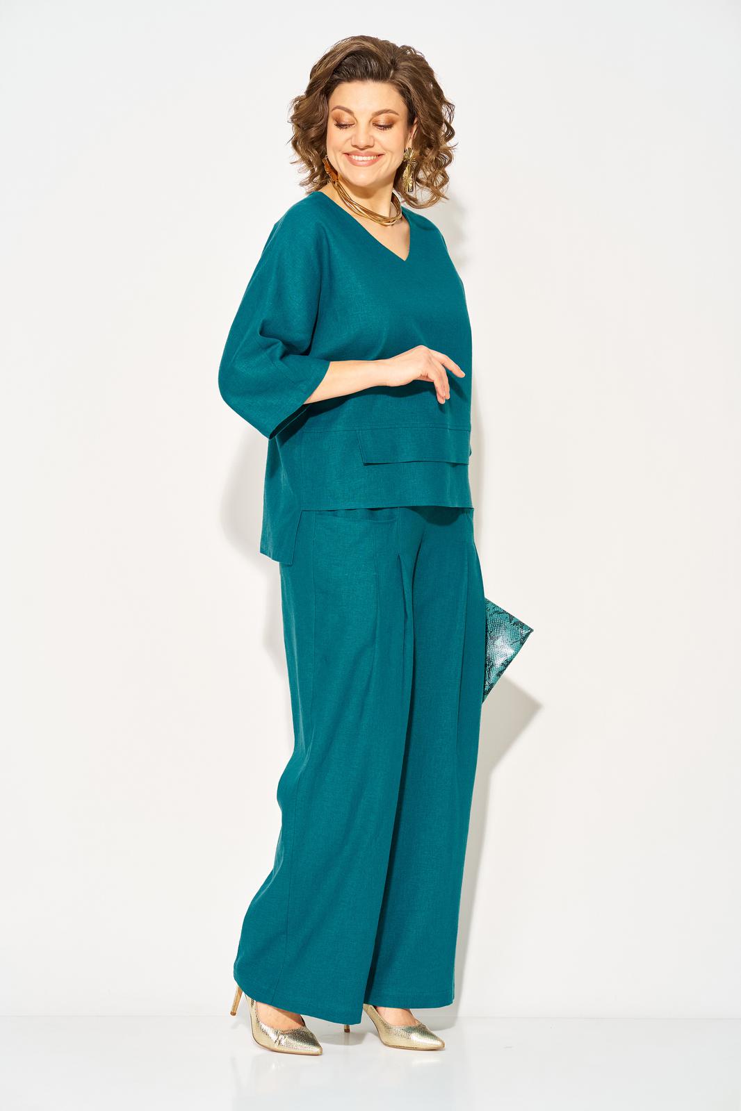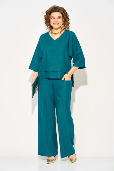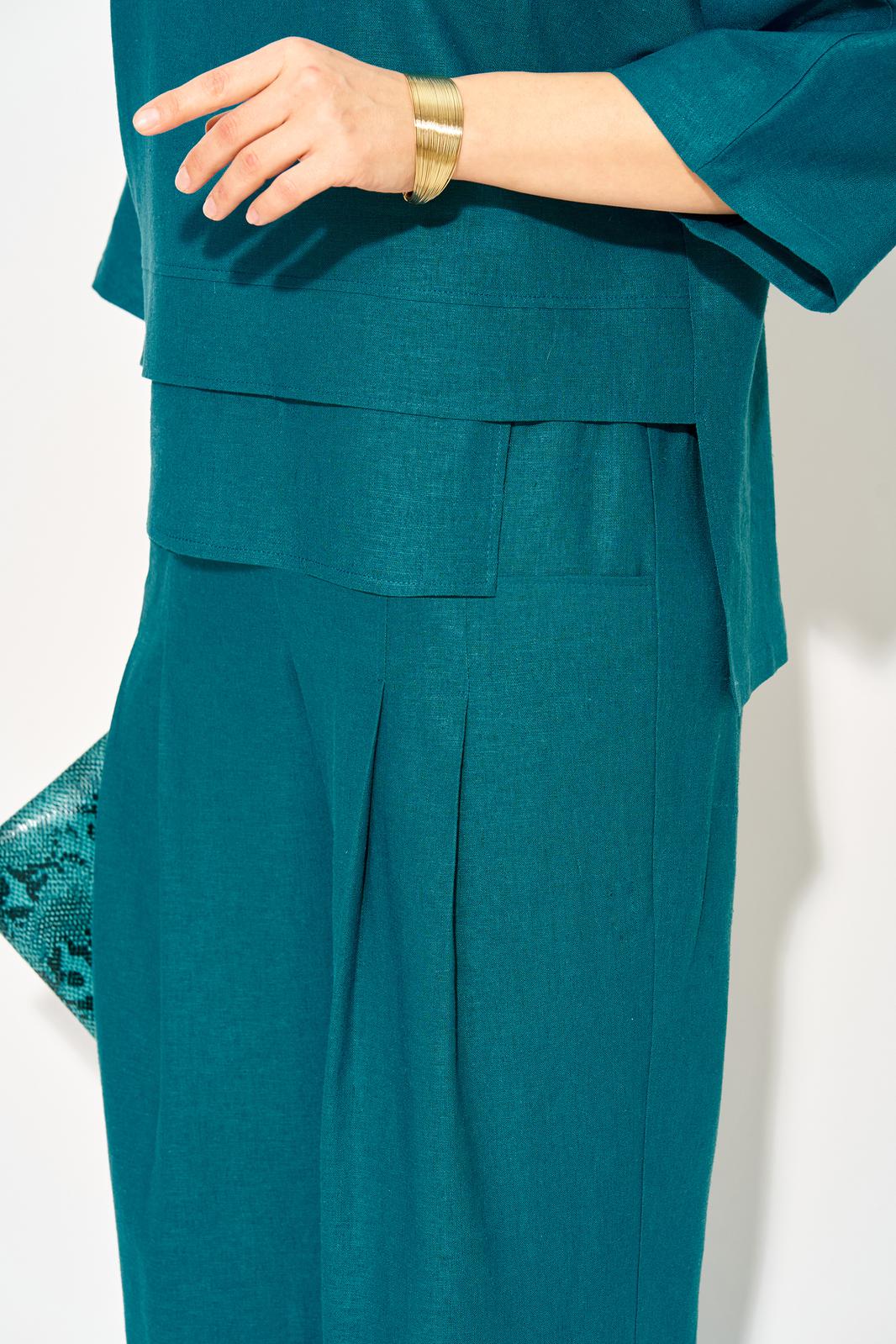 Оригинальный летний костюм, состоящий из туники и брюк. Модель выполнена из легендарного материала – лен с добавлением хлопка. Модель туники свободного силуэта с цельнокроеным рукавом длиной ¾-ти. Лиф V-образным мысом, что зрительно удлиняет силуэт и притягивает взгляды окружающих. Линия низа ассиметричной формы с декоративными планками. Особое внимание уделено свободным брюкам прямого силуэта, на притачном поясе с резинкой по кругу. Оригинальные карманы с заложенными складками создают комфорт и изящество образу.