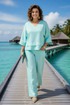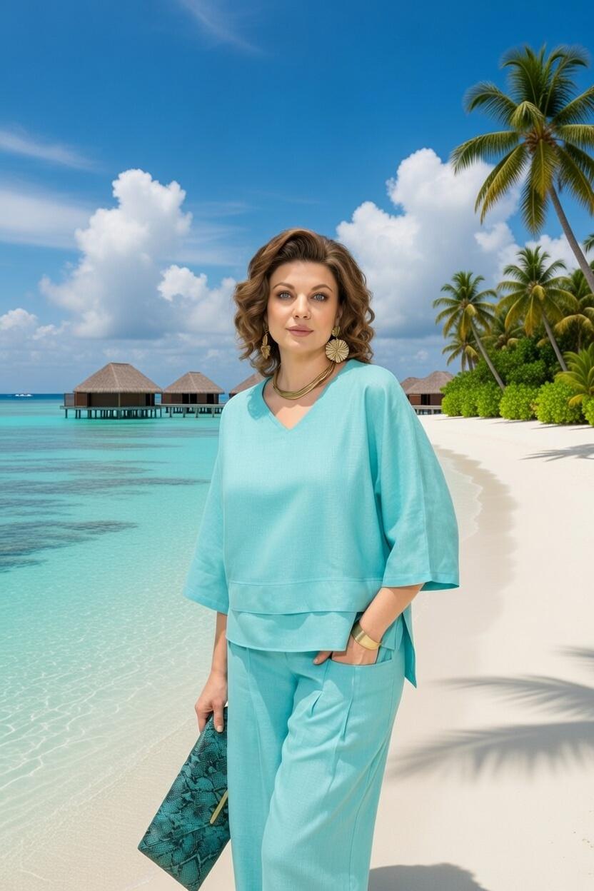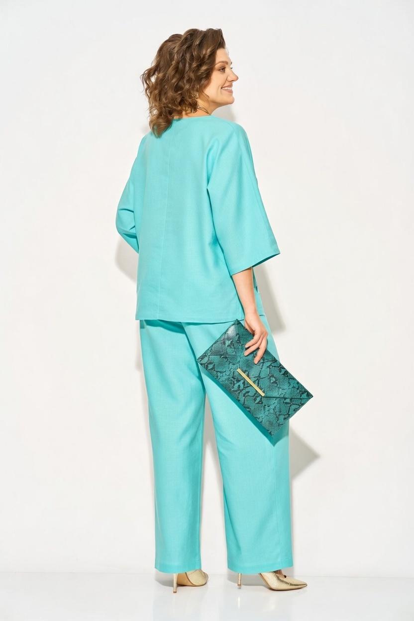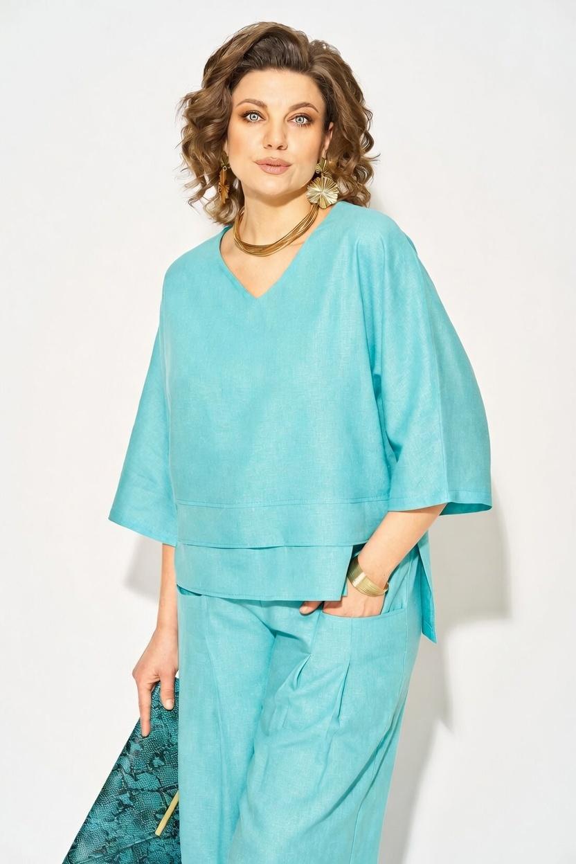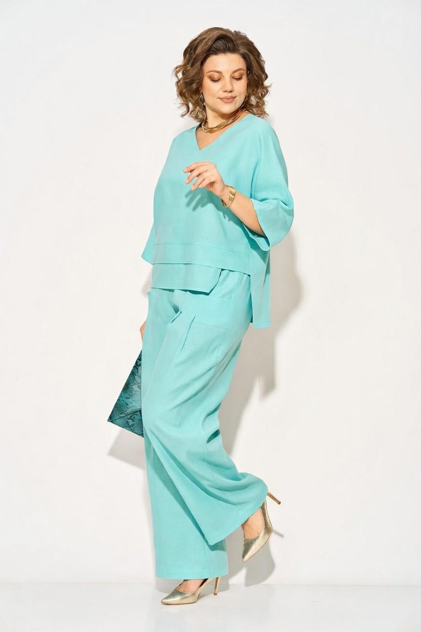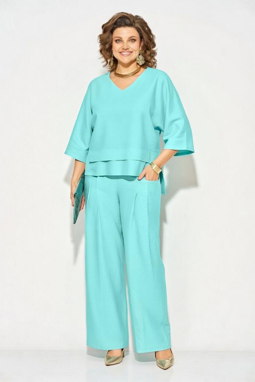 Оригинальный летний костюм, состоящий из туники и брюк. Модель выполнена из легендарного материала – лен с добавлением хлопка. Модель туники свободного силуэта с цельнокроеным рукавом длиной ¾-ти. Лиф V-образным мысом, что зрительно удлиняет силуэт и притягивает взгляды окружающих. Линия низа ассиметричной формы с декоративными планками. Особое внимание уделено свободным брюкам прямого силуэта, на притачном поясе с резинкой по кругу. Оригинальные карманы с заложенными складками создают комфорт и изящество образу.