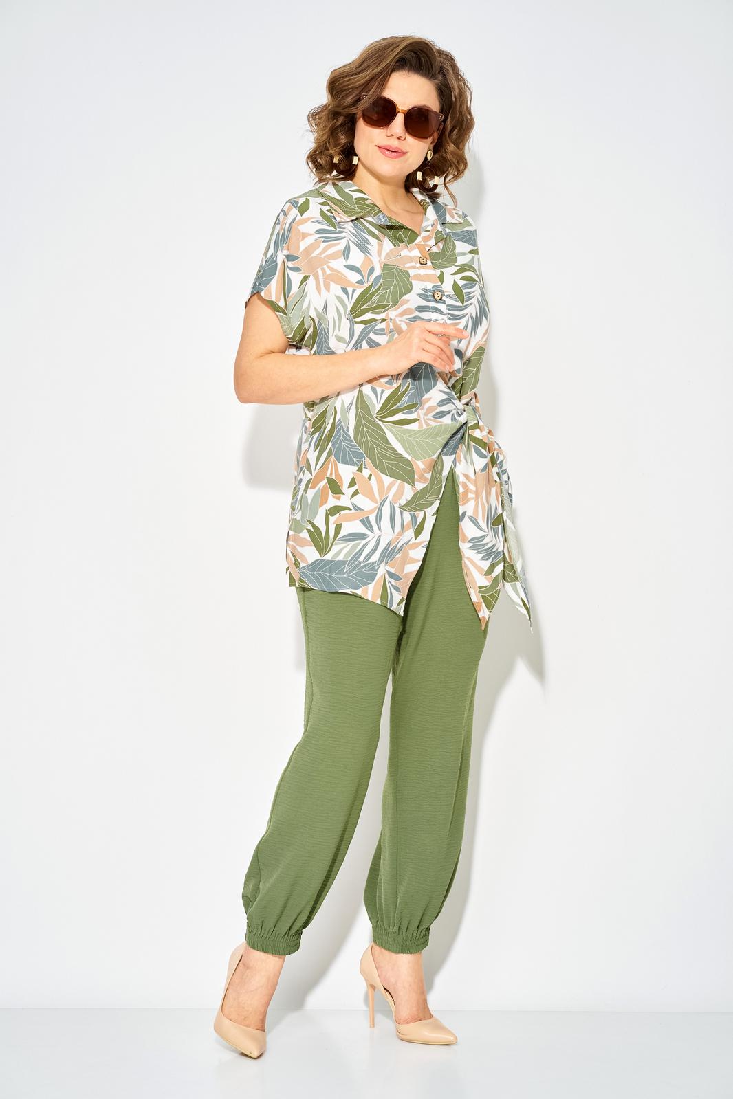 Стильный женский комплект для лета выполнен в современном стиле и отлично подходит для прогулки, отдыха дома или повседневных выходов. Образ состоит из двух частей: свободная хлопковая блузка и облегченные вискозные брюки «султанки». Блузка с тропическим принтом и ассиметричной декоративной завязкой по переду. Рукав цельнокроеный спущенный; воротник отложной на стойке, застежка центральная на пуговицы на притачной планке.