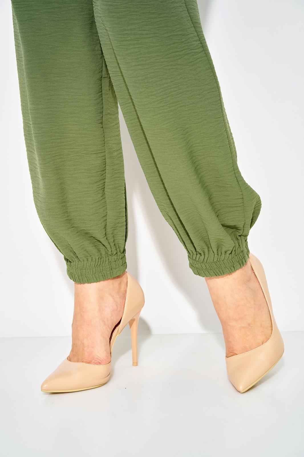 В комплекте брюки свободного кроя со средней посадкой на притачном поясе с круговой резинкой, обеспечивают свободу движений и подчеркивают актуальный брючный тренд - по низу брюк.