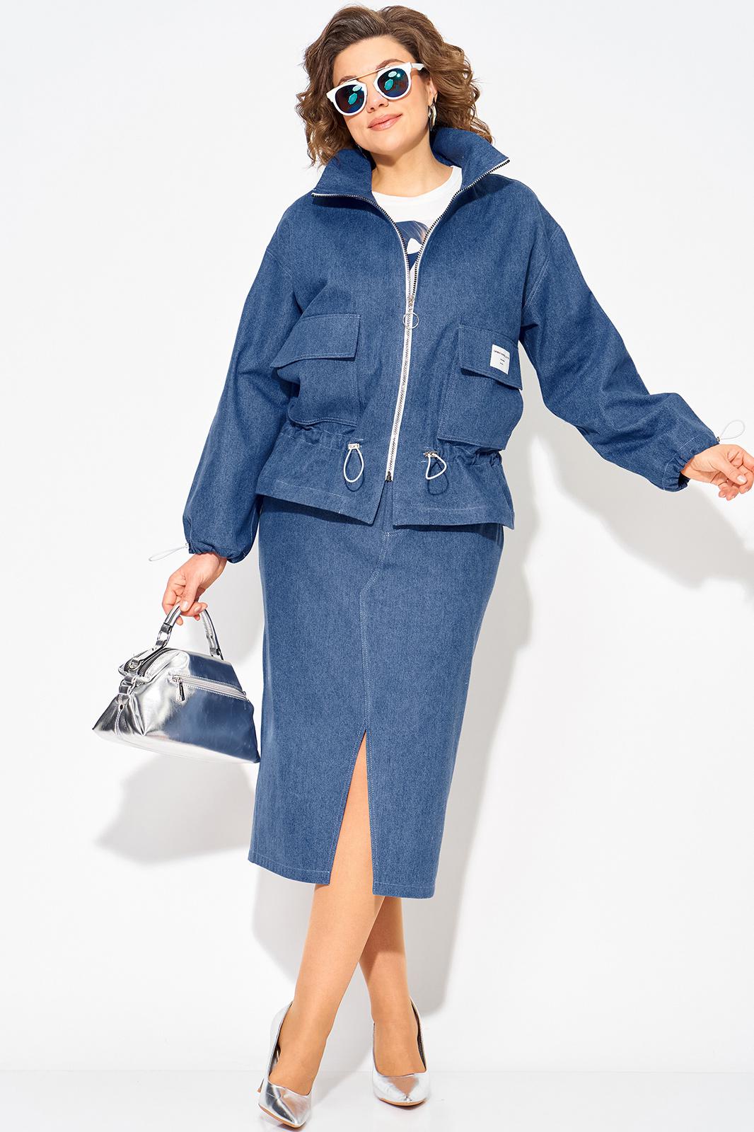 Модный и стильный юбочный женский костюм из денима с жакетом и юбкой — идеальный выбор для создания стильного образа! Жакет свободного силуэта, по типу «джинсовки» с застежкой на молнию. Воротник-стойка, комфортно прилегает к горловине. Рукав длинный, на спущенном плечевом поясе. Низ рукава оформлен на кулиску. Полочка с накладными карманами с клапаном. Чуть ниже талии предусмотрена кулиска для комфортного и более плотного прилегания. Юбка в костюме длиной миди, слегка заужена к низу. Застежка-брючная тесьма-молния с обработанным гульфиком. Пояс притачной, в боковых участках вставлена резинка. В юбке предусмотрены боковые карманы, а также накладные карманы сзади. Фигурный разрез по центру привлекает внимание окружающих!