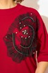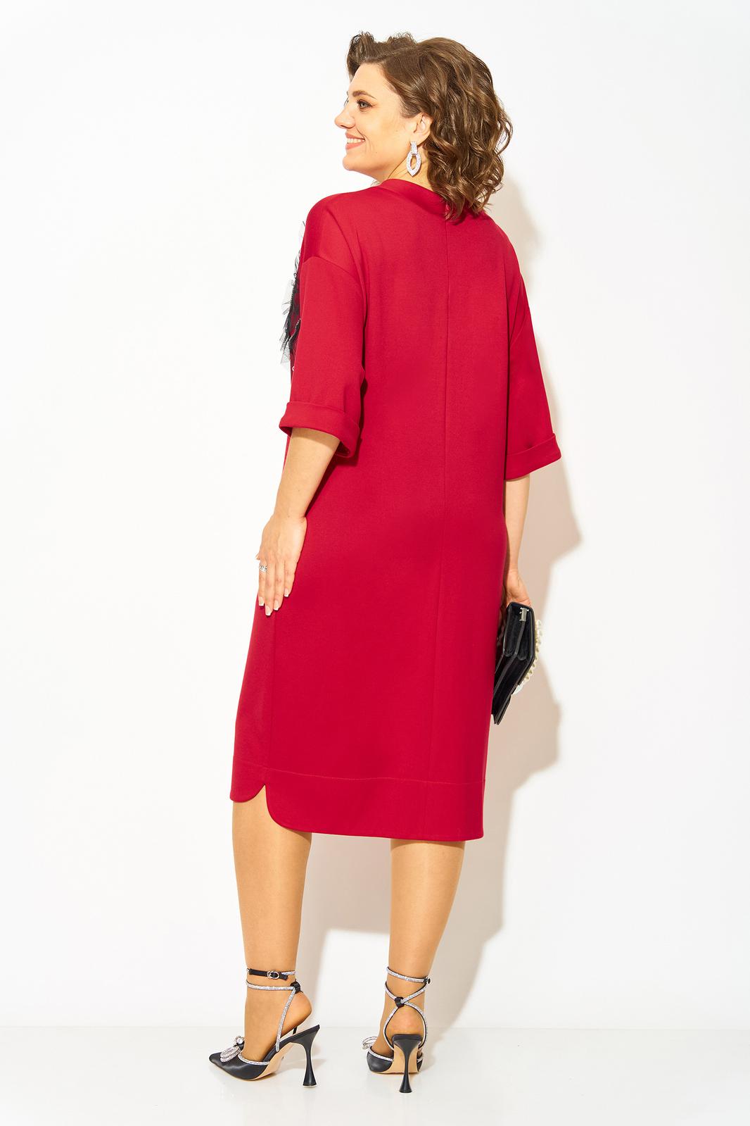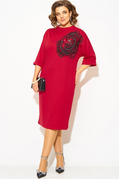 Очень лаконичное и стильное платье определённо привлечёт к себе внимание окружающих. Модель свободного «о»-образного силуэта. Левую часть плеча и груди украшает изысканная печать аппликация в виде цветка с декором из бусин и жемчуга. Платье с мягко лежащей стойкой у горловины. Рукав длиной ¾-ти, на притачной манжете на отворот. Модель слегка заужена к низу, с разно уровневым фигурным низом, оформленный обтачкой. В платье предусмотрены карманы.