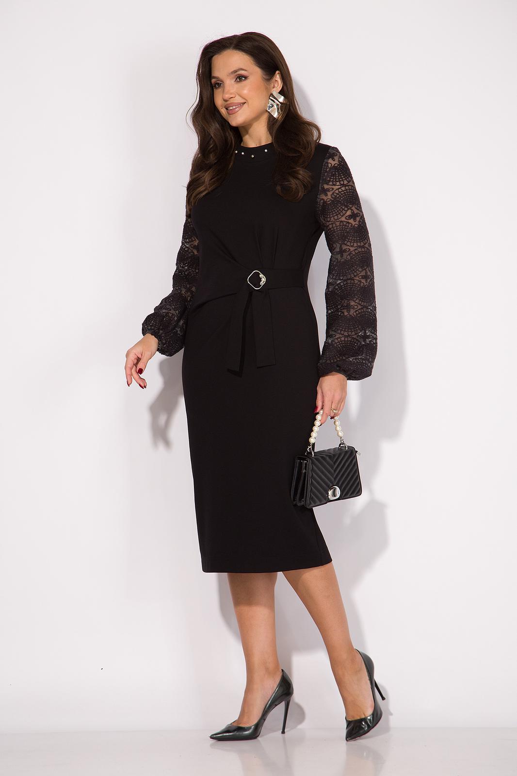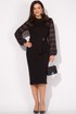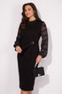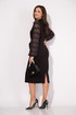 Эта модель платья из мягкого, уютного трикотажа подходит как для повседневного использования, так и для торжественных мероприятий. Прочная и эластичная ткань делает его незаменимым элементом вашего гардероба. Облегающий силуэт с эффектным подрезом по линии талии, переходящий в пояс с металлической пряжкой акцентирует фигуру и создает стильный, утончённый вид. Мягкая полулежащая стойка у горловины украшена пробивными бусинами из жемчуга. Спинка с центральным швом и обработанной шлицей по низу изделия. Застежка – потайная тесьма-молния по спинке. Эффектный ажурный рукав из сетки с вышивкой крючком дополняют и без того элегантный образ.