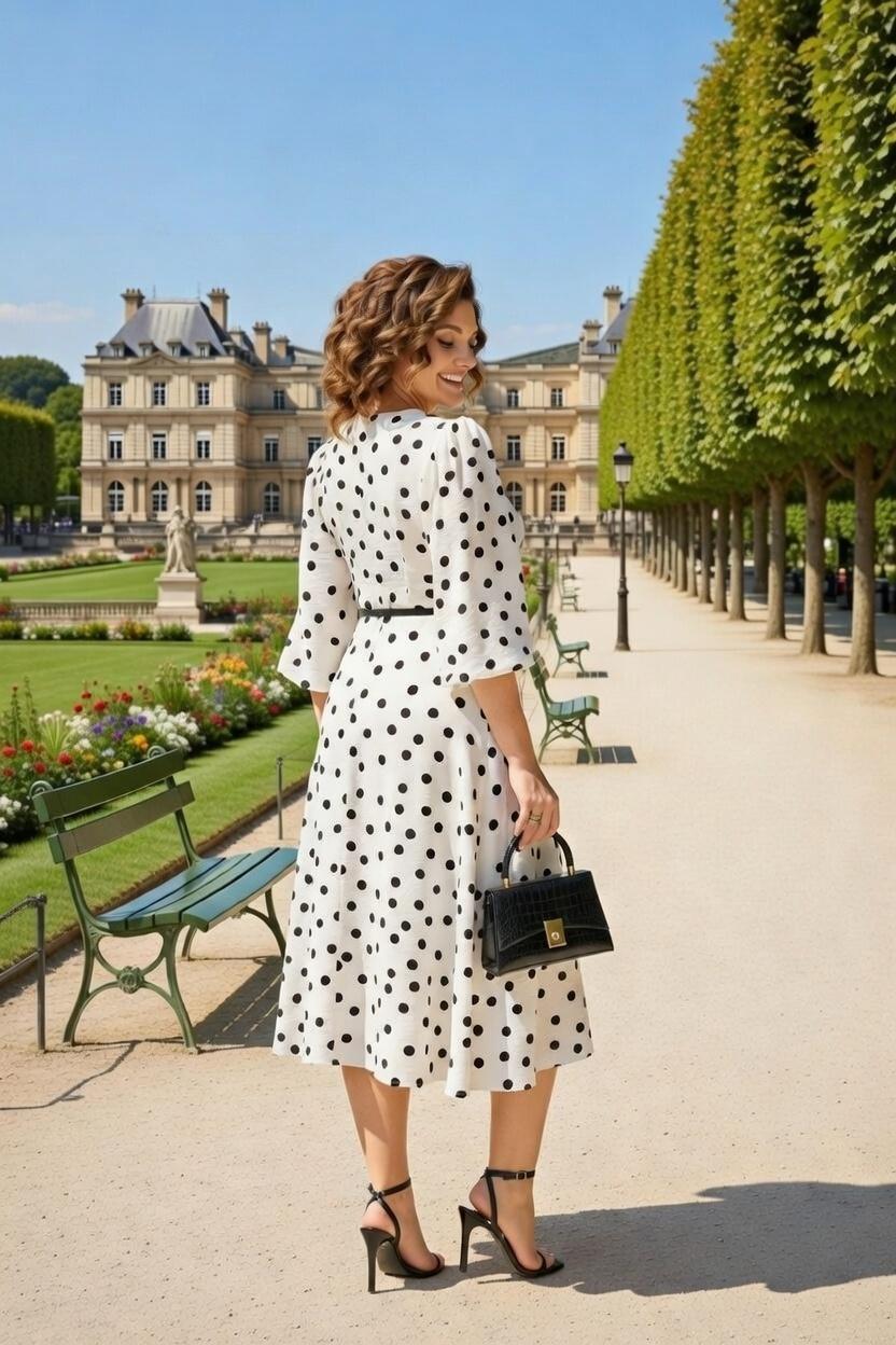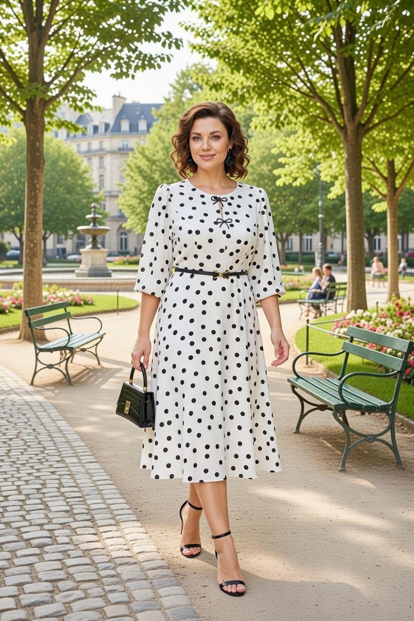 Волшебное и неповторимое - это женское платье с округлым вырезом горловины в горох, созданное талантливым дизайнером олицетворяет элегантность и стиль. Выполненное из вискозно-хлопкового материала, это платье обеспечивает комфорт и свободу движений. Модель отрезная по линиям талии, с продольными рельефами по полочке. Юбка расклешена к низу – полу солнце. Эффектный рукав-фонарик длиной ¾-ти, присборен по окату и поставлен на трикотажную подкладку. Небольшая капелька по лифу украшена съёмными брошами в виде банта. Застежка – потайная тесьма-молния по спинке.Низ юбки на подкладке.