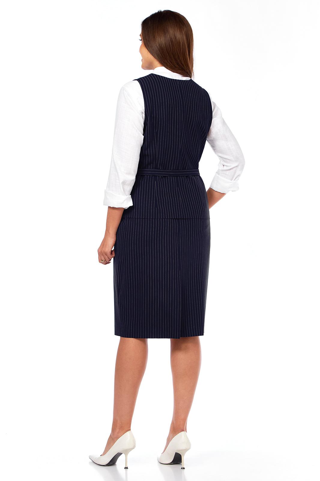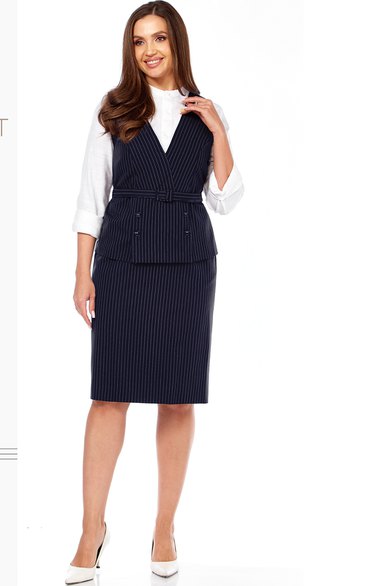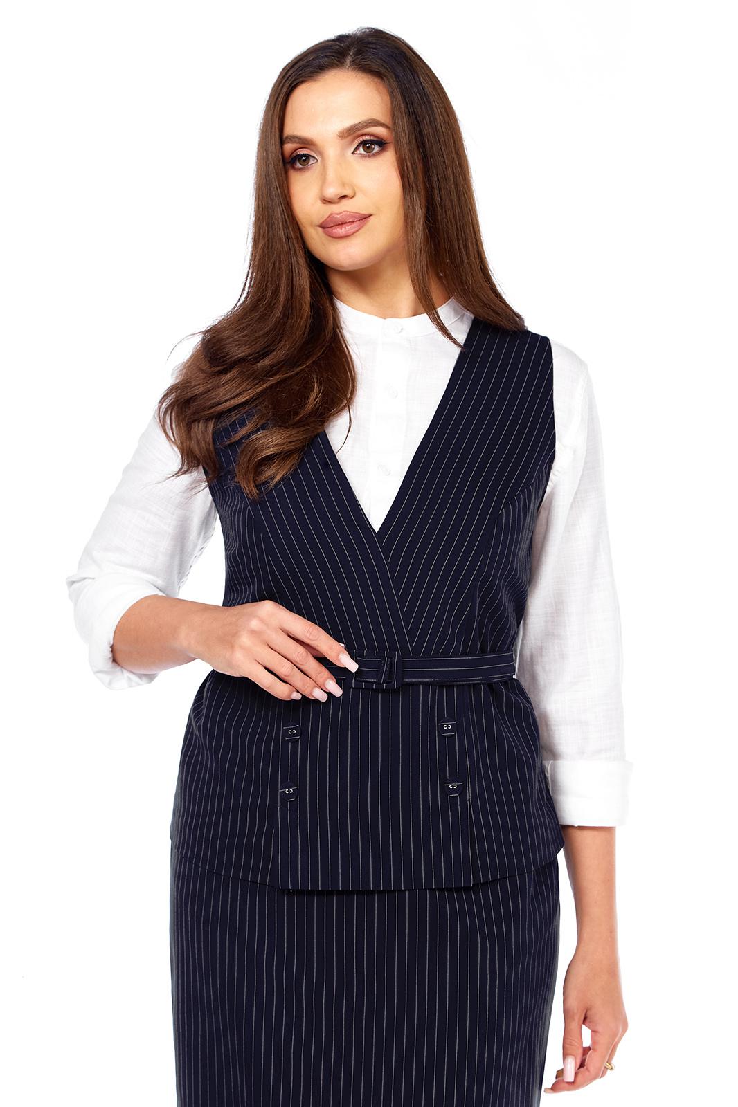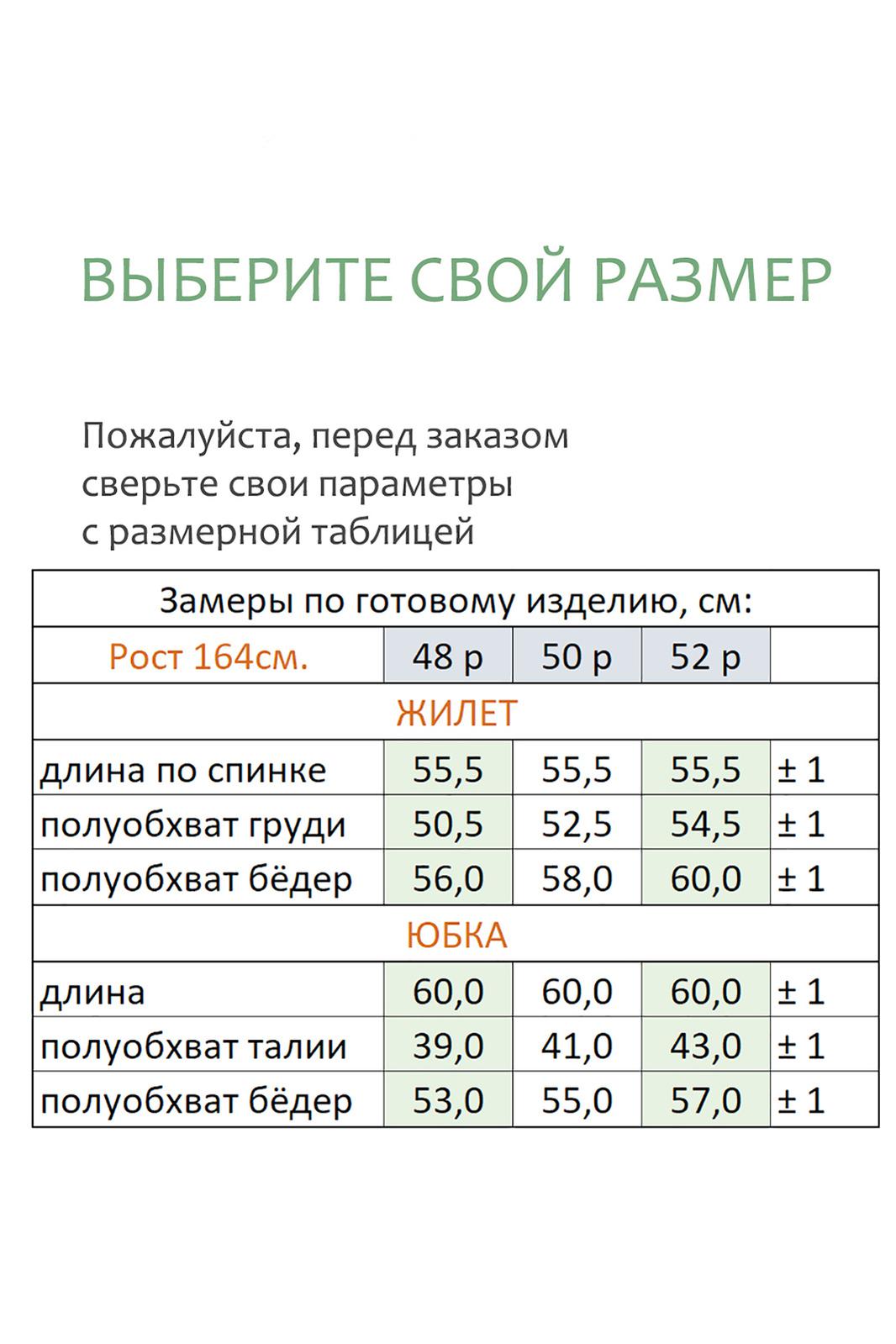 Повседневный текстильный 2-х предметный комплект на рост 164 см. Жилет полуприлегающего силуэта. По переду жилета рельефы и нагрудные вытачки из проймы. Вырез горловины V-образный, с имитацией запаха. Баска жилета со шлицами. Дополнен поясом с обтяжной пряжкой. По спинке -- средний шов и талиевые вытачки. Юбка на подкладке, слегка зауженная к низу, на поясе, по бокам от вытачки до вытачки с эластичной лентой. Сзади средний шов со шлицей и застежкой на пуговицу и молнию.