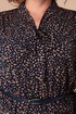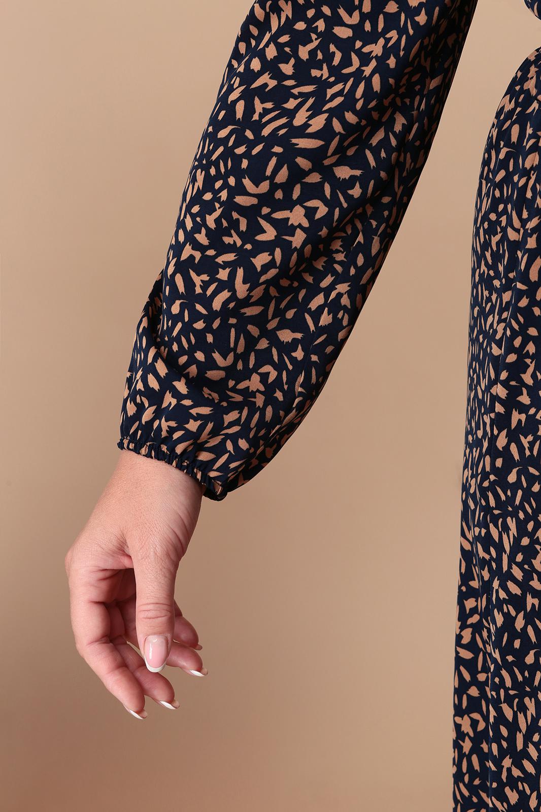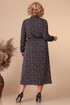 Удлиненное женское платье, выполненное из струящейся текстильной ткани с принтом. По талии платье отрезное на резинке, низ платья расширенный. Рукав втачной длинный, внизу на резинке. На плечах спереди кокетки, под которыми сборки. Вырез горловины V-образный с воротником стойкой, переходящим в завязку. Длина спинки -- 124см. ПОГ:54р-60,5см, 56р-62,5см, 58р-64,5см. ПОТ:54р-41-61см, 56р-43-63см, 58р-45-65см. ПОБ:54р-75см, 56р-77см, 58р-79см.