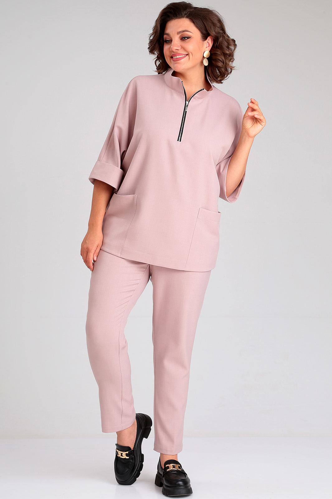 Комплект женский 2-х предметный: блуза и брюки. Блуза свободного кроя, с цельнокроеным рукавом. Низ рукава на притачной манжете. По переду блузы молния, накладные карманы. Воротник стойка. Брюки заужены к низу. На передних половинках брюк боковые карманы с наклонным входом. Верхний срез брюк на притачном поясе на резинке с тесьмой из основной ткани. Длина блузы по середине спинки: 70 см. Длина рукава от горловины: 53 см. Длина брюк по боковому шву с учётом пояса: 104 см.