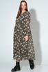 Комплект: платье и жилет. Шифоновое платье свободного силуэта на трикотажной подкладке. Горловина овальной формы. Платье отрезное чуть выше линии талии, на сборке. Рукав втачной. Низ рукава собран на эластичную тесьму. Жилет с нагрудными вытачками, отложными лацканами и двубортной застёжкой на петли и пуговицы. Спинка жилета с отлетной деталью. По низу жилета располагаются шлёвки с продетым в них съёмным поясом. Жилет на подкладке. Длина жакета по середине спинки: 44 см. Длина платья по середине спинки: 124 см. Длина рукава: 60 см.