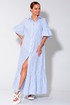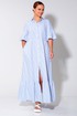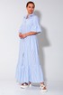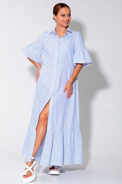 Платье длиной макси, выполнено из хлопковой ткани. Полочка платья с отрезной планкой по центру и застежкой на петли и пуговицы. Лиф платья отрезной, юбка со сборкой которая по низу обработана воланом. Рукав одно шовный, втачной. Низ рукава обработан воланом. Горловина обработана притачным воротником рубашечного типа, на стойке. В боковых швах обработаны карманы.