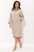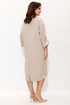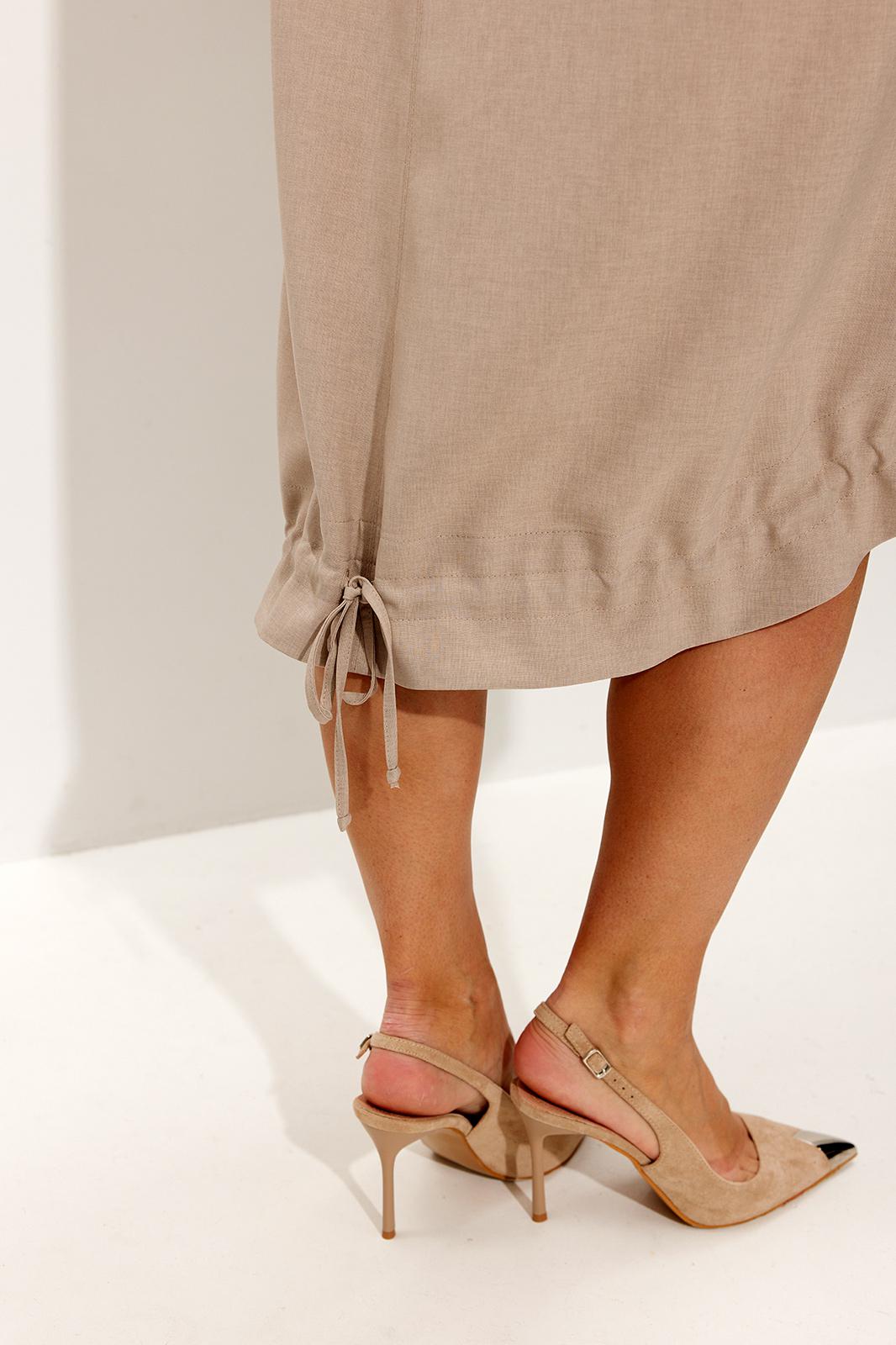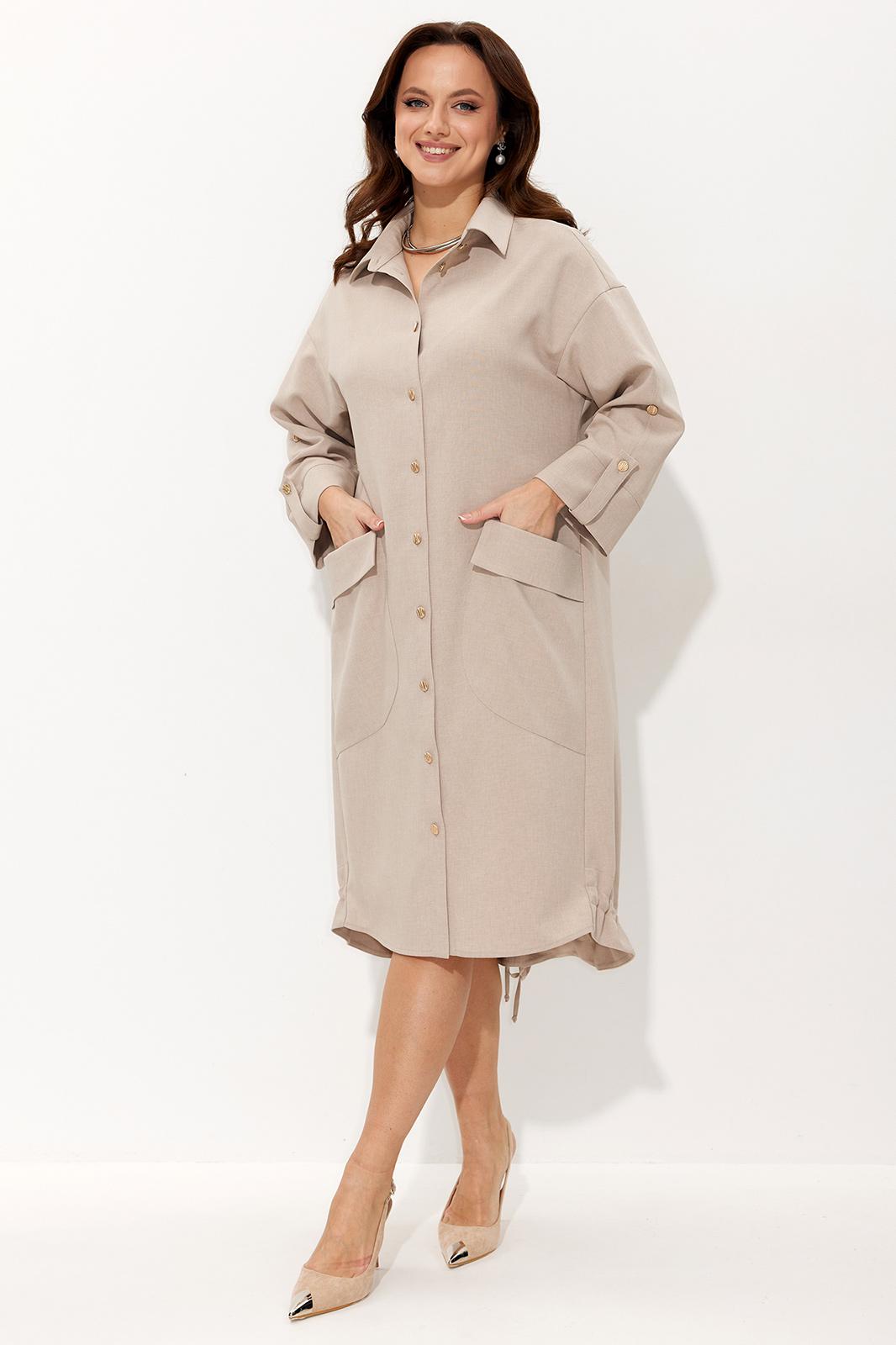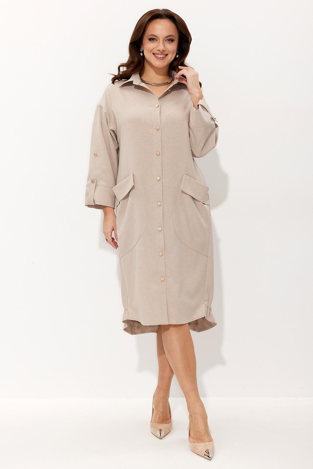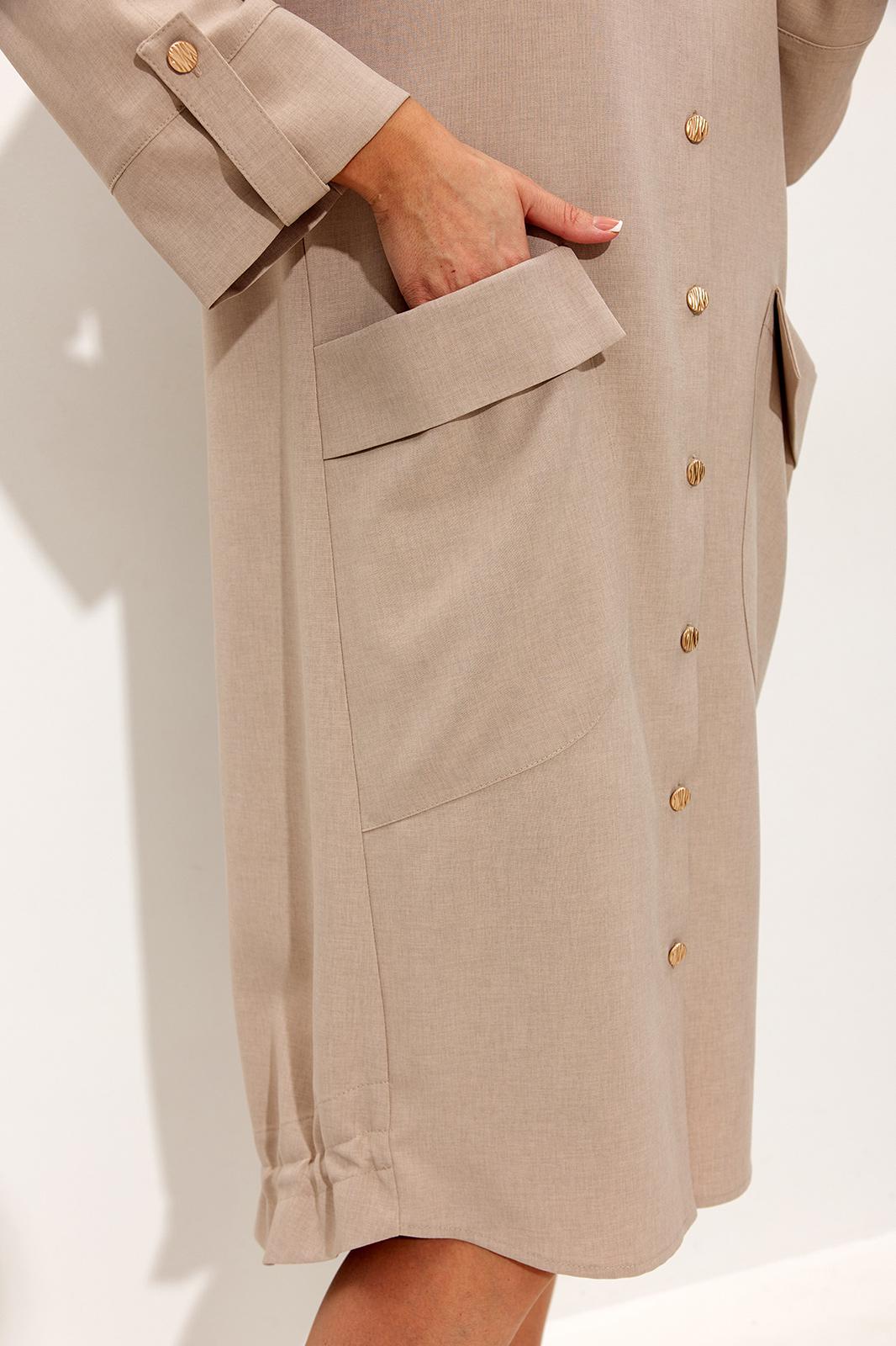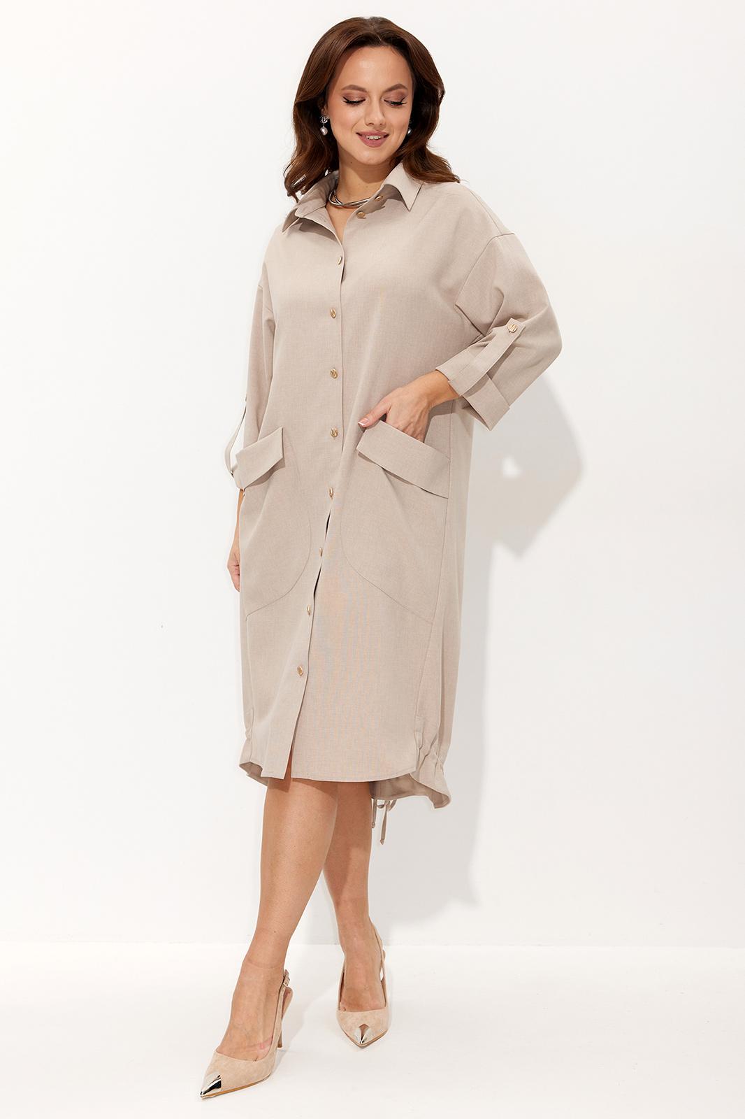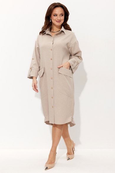 Платье свободного силуэта со спущенной линией плеча. Воротник рубашечного типа на стойке. Центральная застёжка на петли и пуговицы. По передним половинкам платья накладные карманы с цельнокроеным клапаном. Низ платья фигурный. Спинка платья чуть длиннее переда, по низу обработана обтачкой. Низ присборивается на шнур из основной ткани, таким образом формируя желаемый силуэт платья. Рукав двухшовный. Низ рукава на притачной манжете с патой. По верхнему центральному шву рукава пришиты две пуговицы, что позволяет регулировать длину рукава.