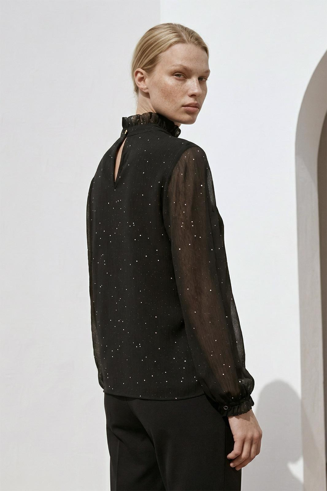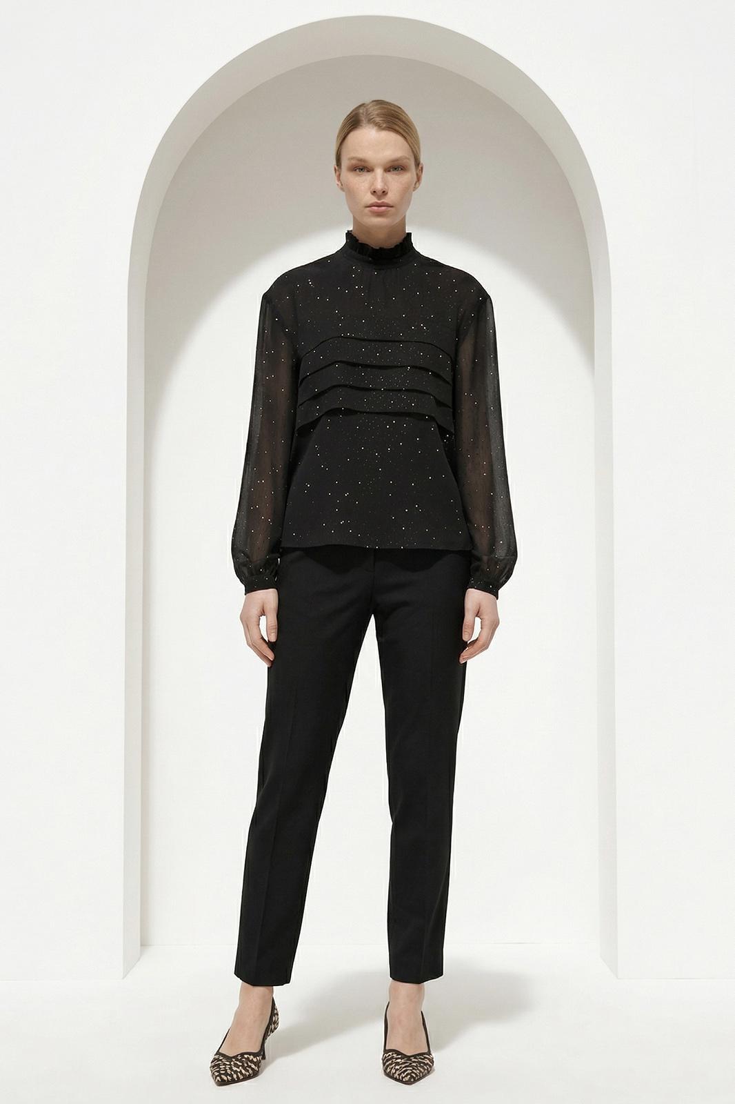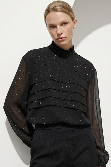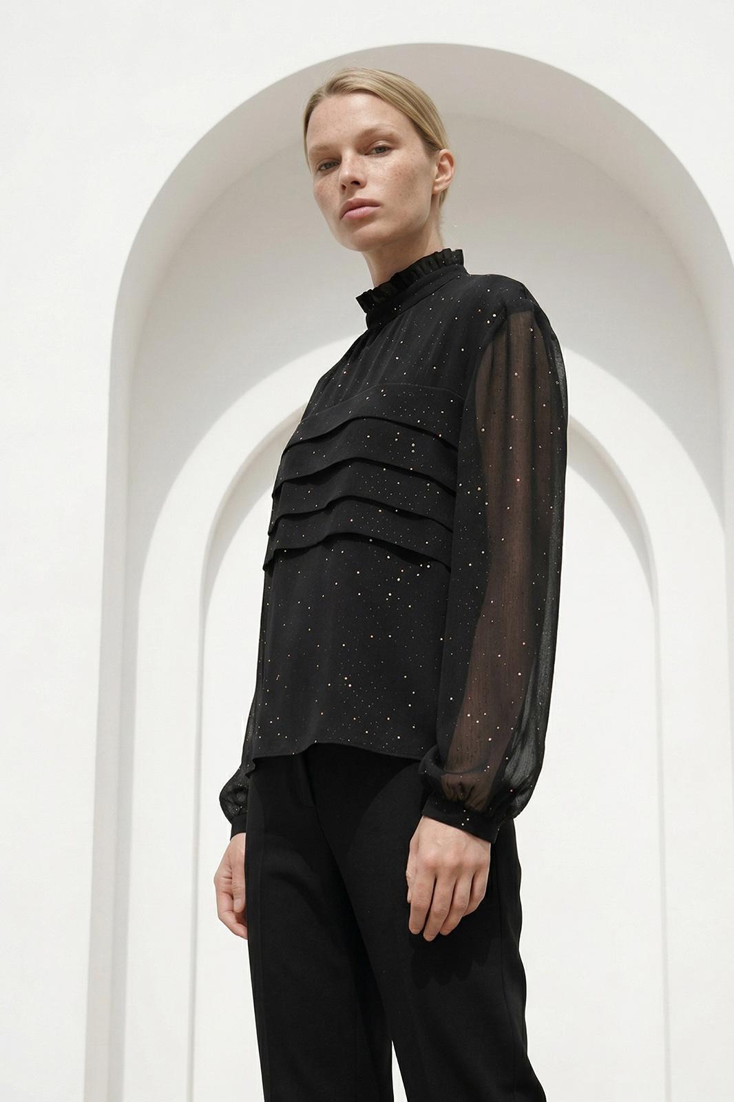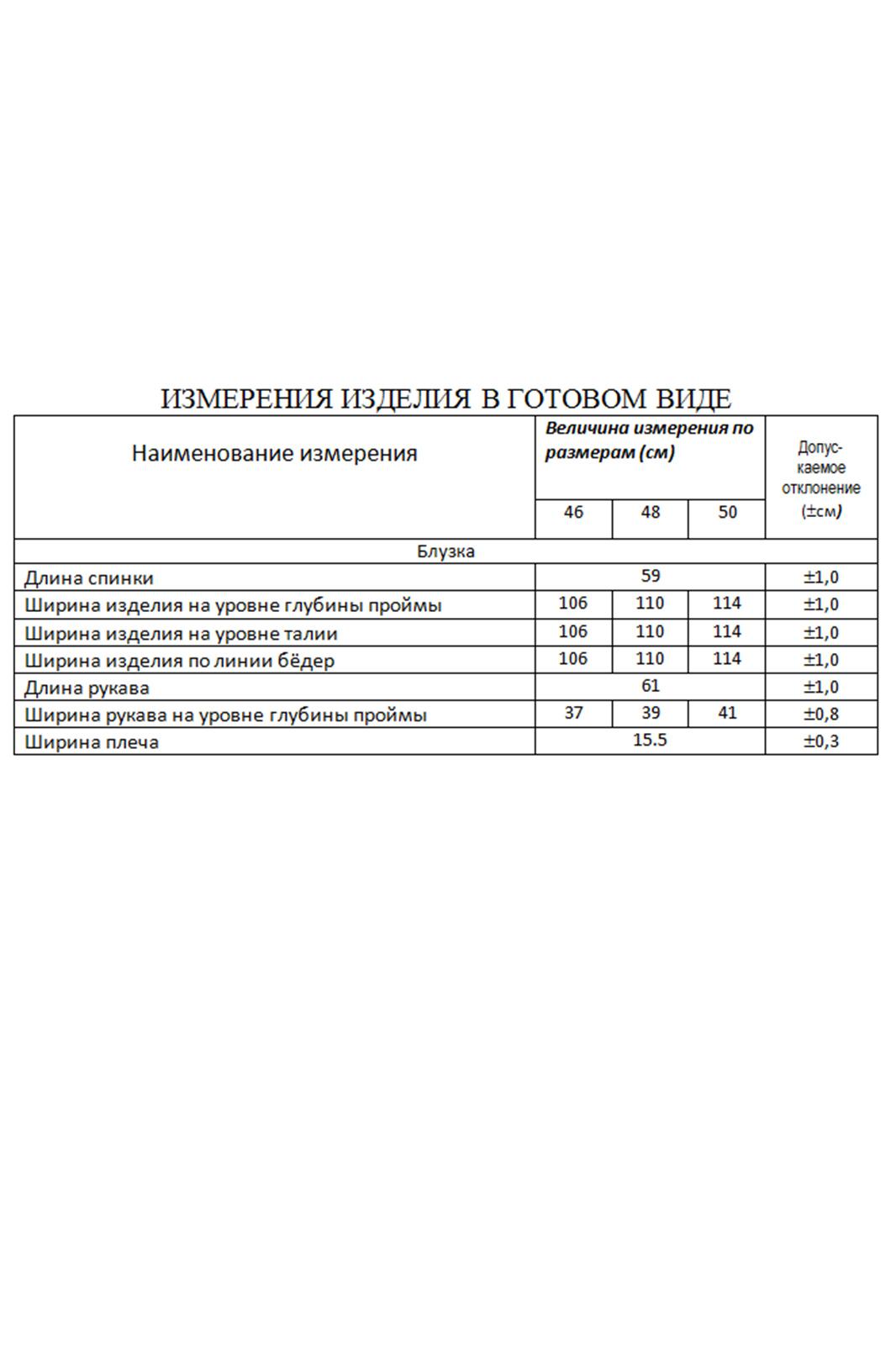 Блузка с воротником стойкой. Перед со складками на уровне груди и сборкой от горловины. Спинка с застёжкой на петлю и пуговицу от горловины. Рукава втачные с манжетами и с застёжкой на пуговицу по низу.