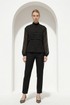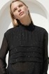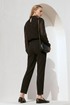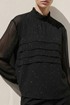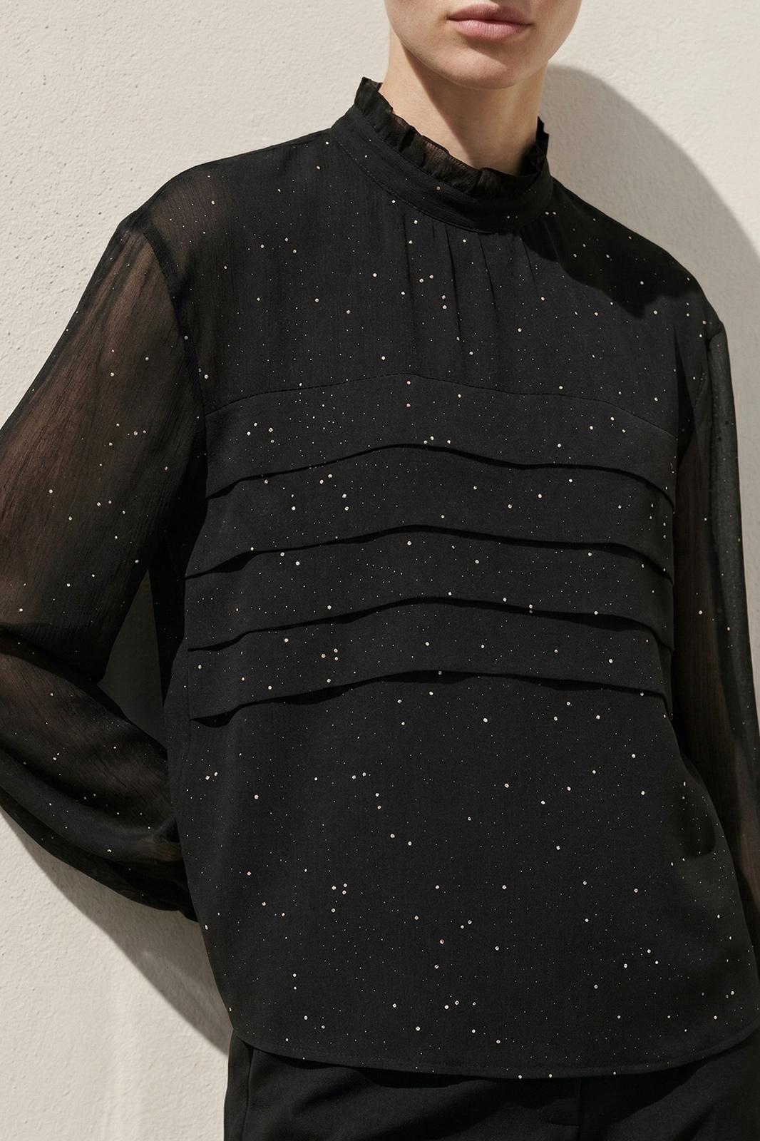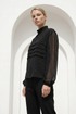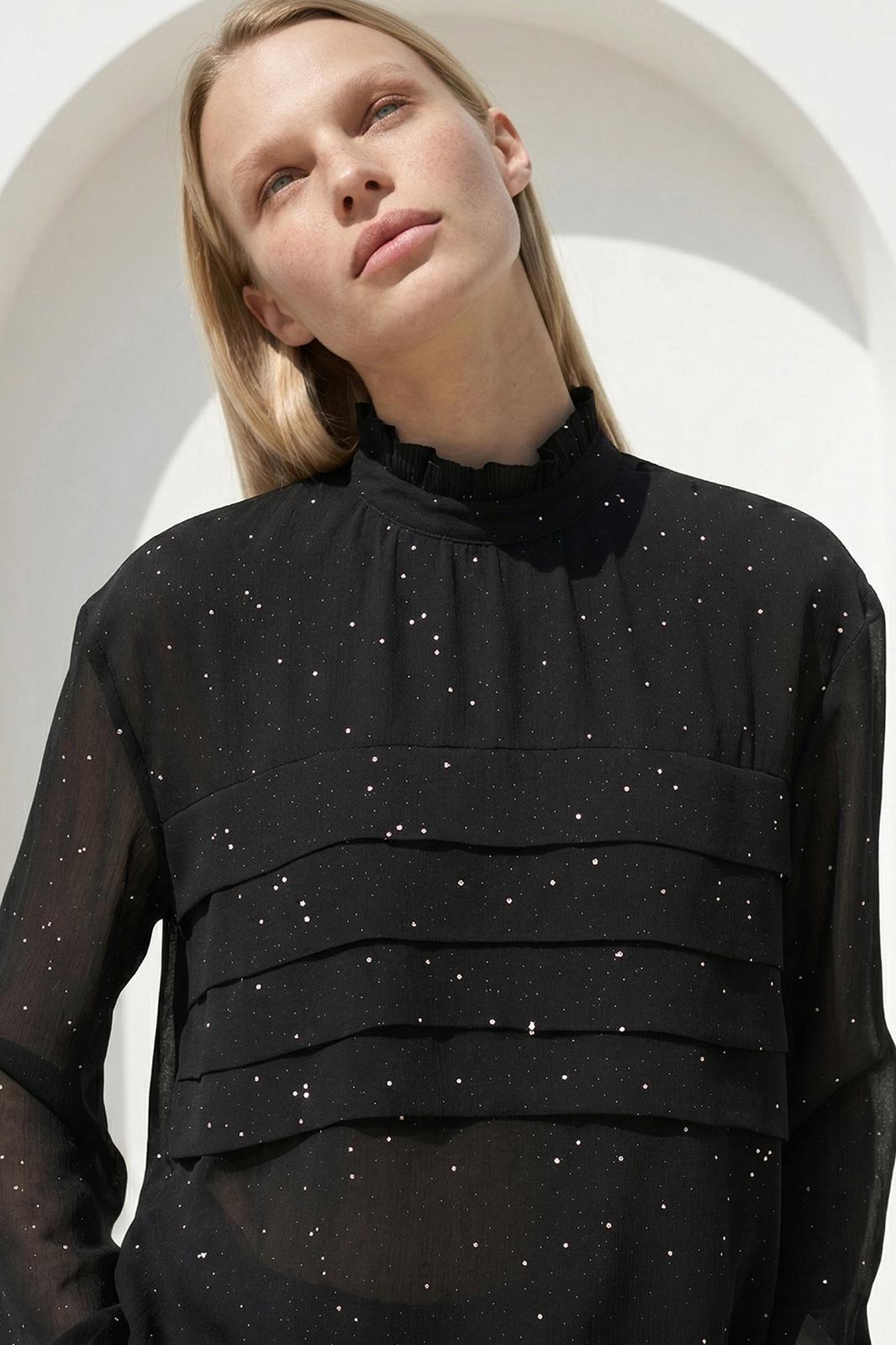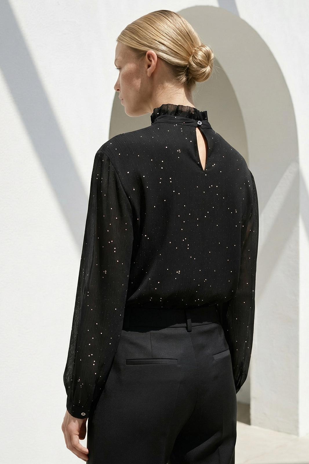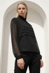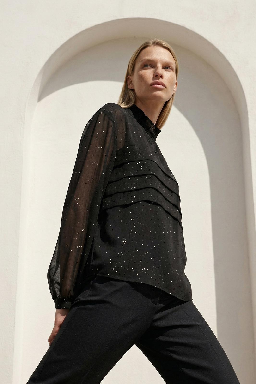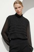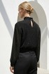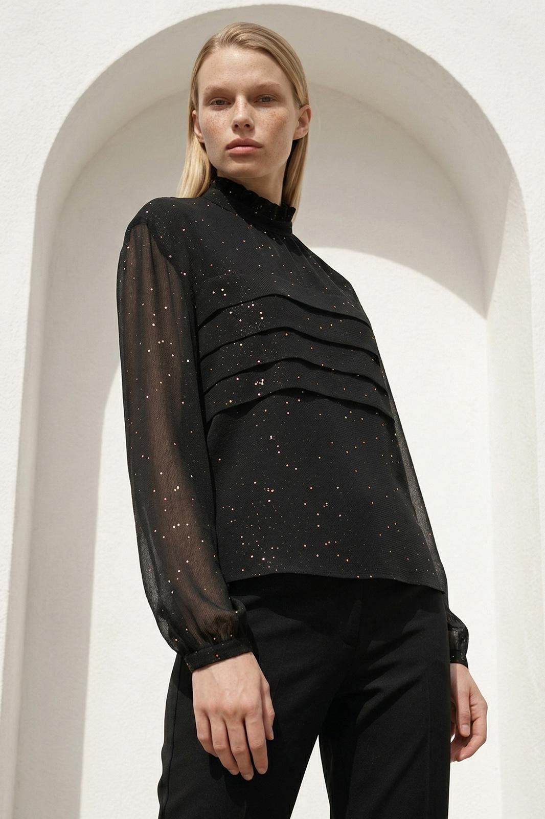 Блузка с воротником стойкой. Перед со складками на уровне груди и сборкой от горловины. Спинка с застёжкой на петлю и пуговицу от горловины. Рукава втачные с манжетами и с застёжкой на пуговицу по низу.