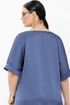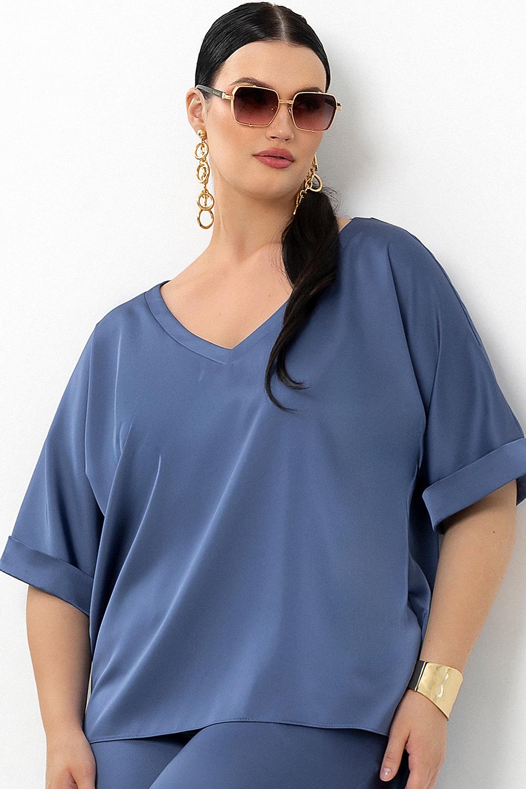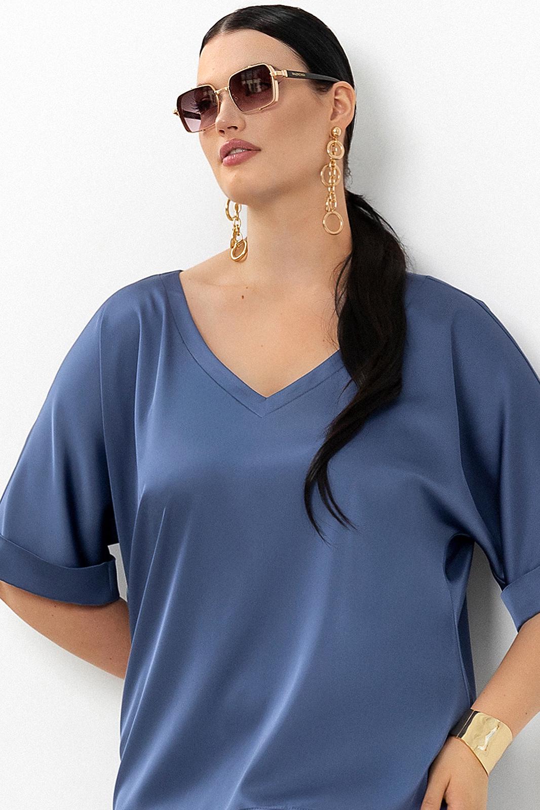 Блуза с V – образным вырезом горловины, фигурным низом и цельнокроеными рукавами. Рукава с манжетами по низу.