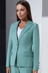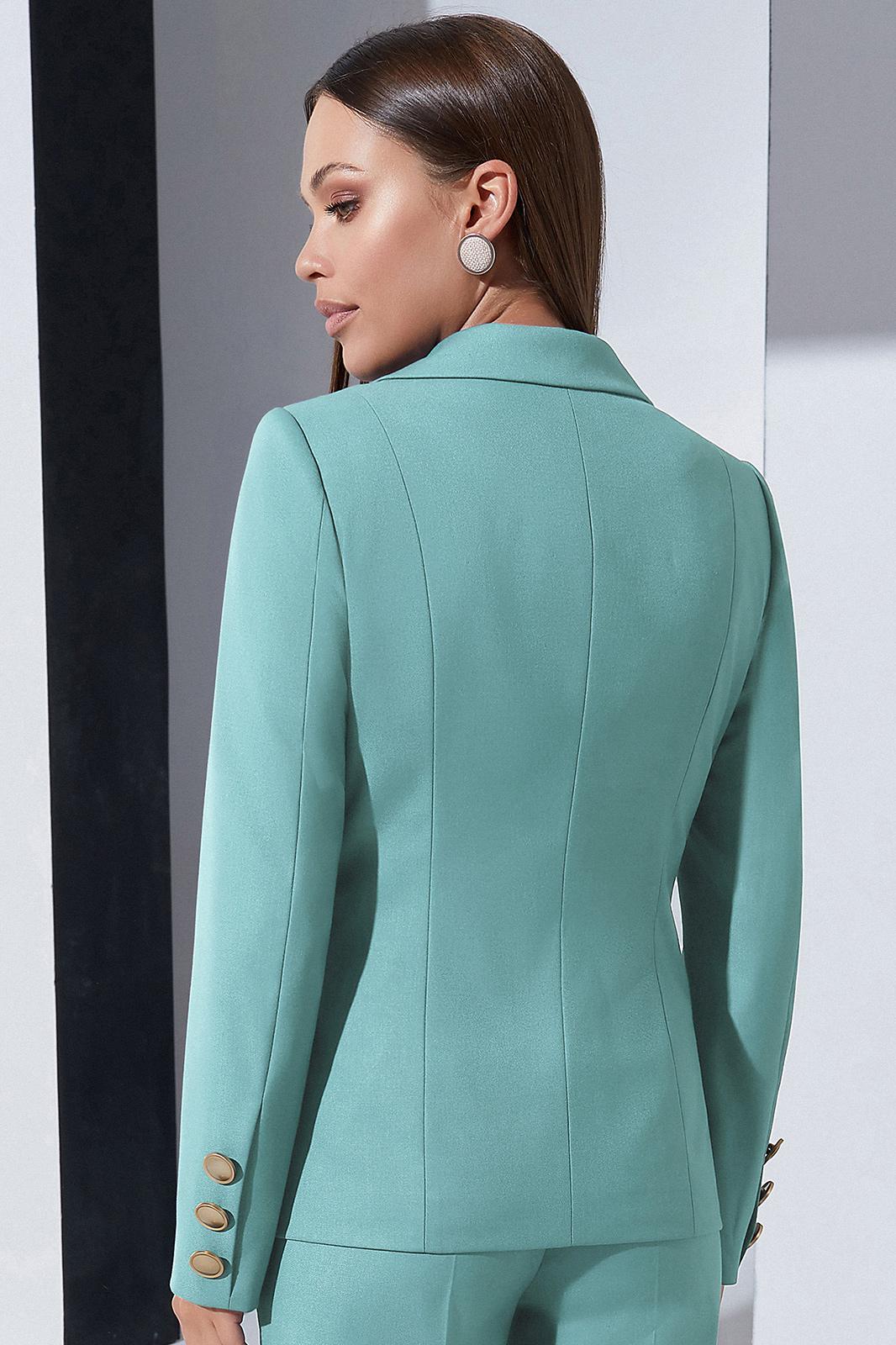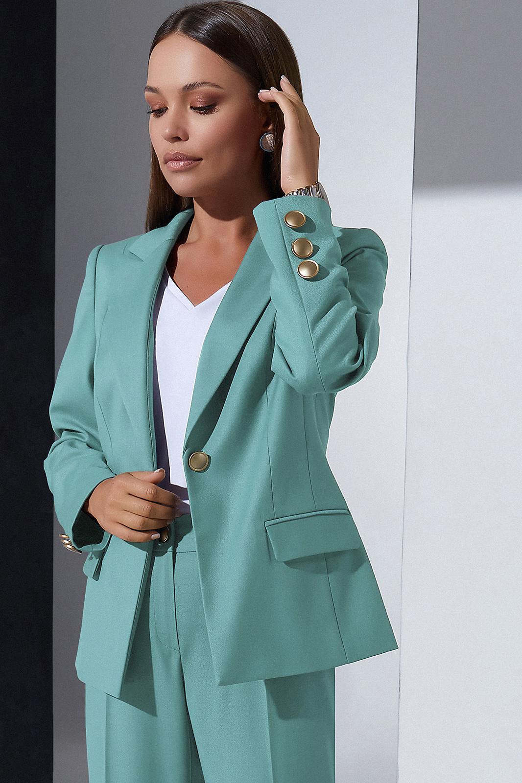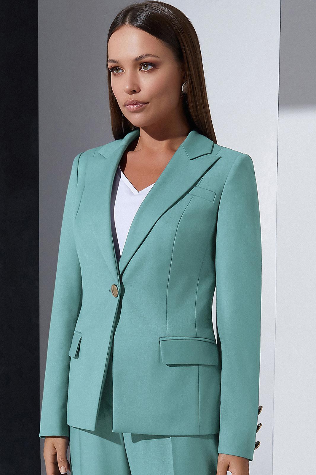 Жакет со стояче-отложным воротником пиджачного типа и центральной застёжкой на петлю и пуговицу. Перед с карманами с клапанами в нижней части. Спинка со средним швом и двумя рельефами. Рукава втачные, с декоративными пуговицами по низу. Жакет на подкладке.