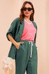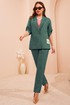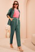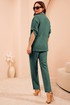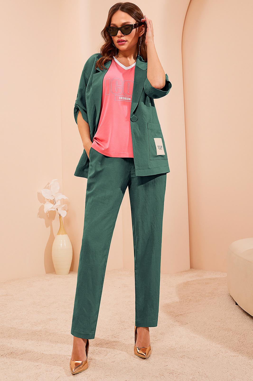 Дизайнерский брючный костюм выполненный из натурального льна отличный выбор для этого лета. Жакет прямого силуэта мягкой формы с воротником пиджачного типа и V-образным вырезом, застегивается на пуговицу обтянутую тканью. Перед оформлен нагрудными вытачками от плеча и настрочными карманами, спинка со средним швом и талиевыми вытачками. Линия плеча спущена, рукав с отворотом фиксируется патой. Футболка с V-образным вырезом и цельнокроеным рукавом выполнена из вискозы с контрастной отделкой. Перед украшен авторским принтом в тон отделке. Свободые брюки средней посадки с косыми карманами и отрезным поясом . Перед пояса с застежкой на пуговицу и гульфик с молнией от боковых швов вставлены шнурки, спинка пояса на резинке.