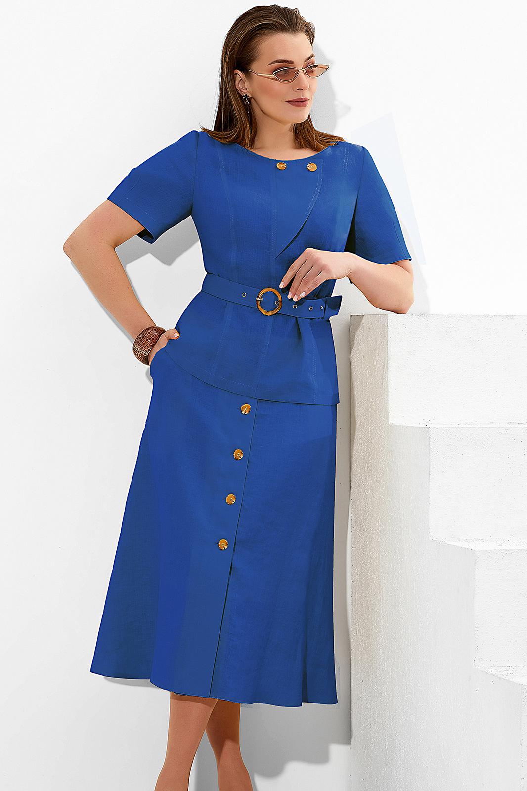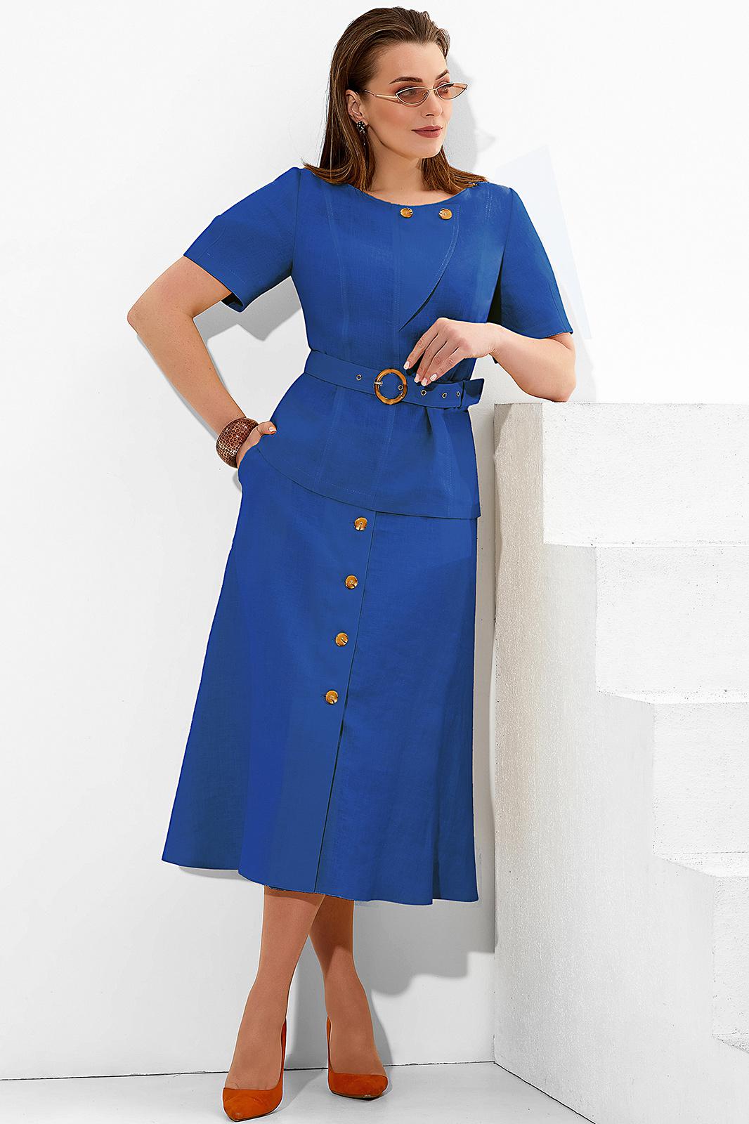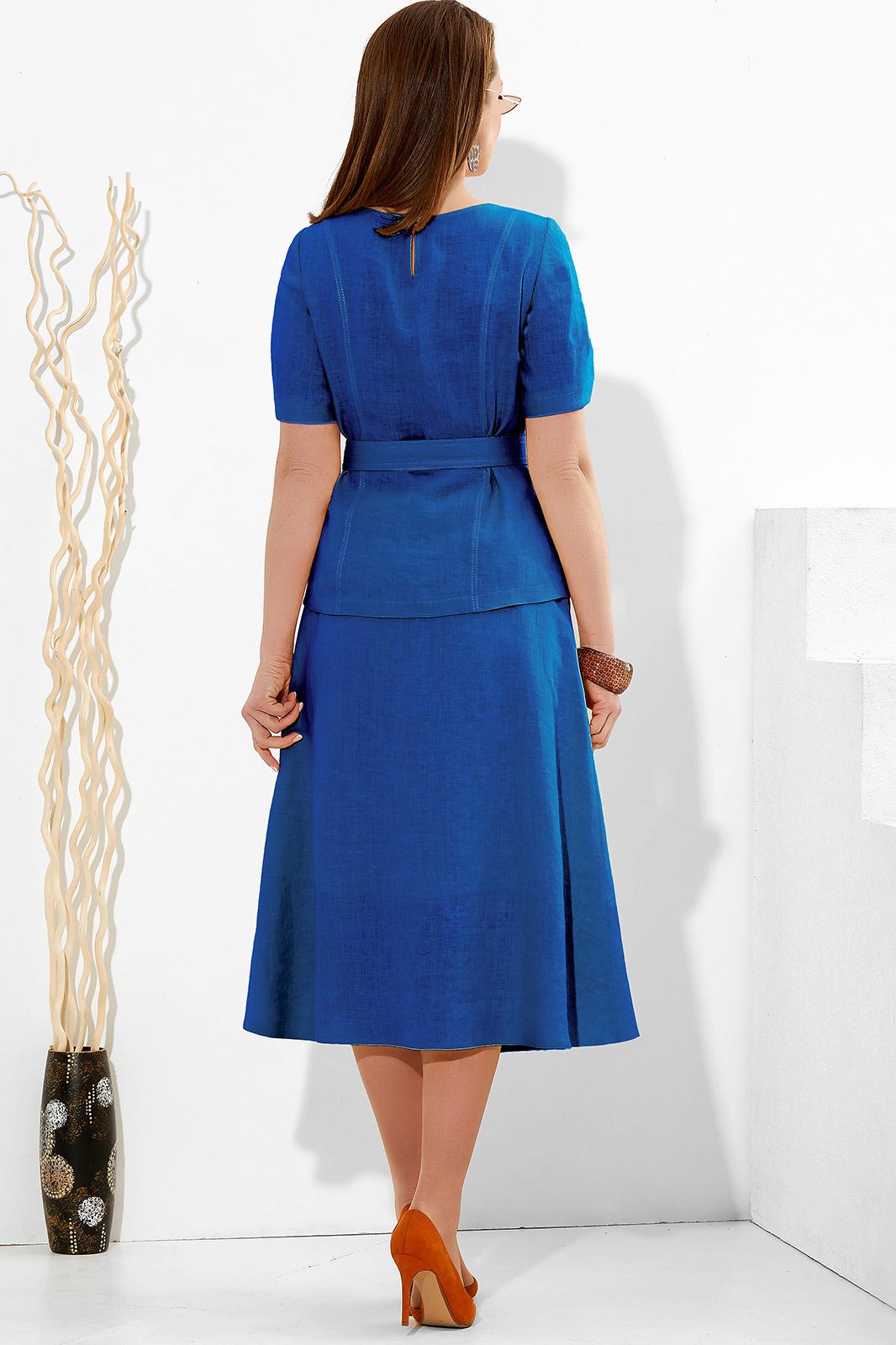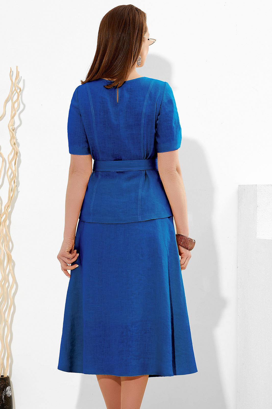 Блуза с округлым вырезом горловины и съёмным поясом на уровне талии. Перед с дизайнерским элементом в верхней части. Спинка с рельефами и застёжкой на петлю и пуговицу от горловины. Рукава втачные. Юбка на поясе. Переднее полотнище с застёжкой на петли и пуговицы и наклонными карманами к боковым швам. Юбка на подкладке. Лён в производстве одежды используется на протяжении нескольких столетий, и его популярность продолжает расти. А всё потому, что данная ткань обладает уникальными свойствами такими, как: антибактериальность, гипоаллергенность, антисептичность, воздухопроницаемость и экологичность.