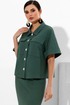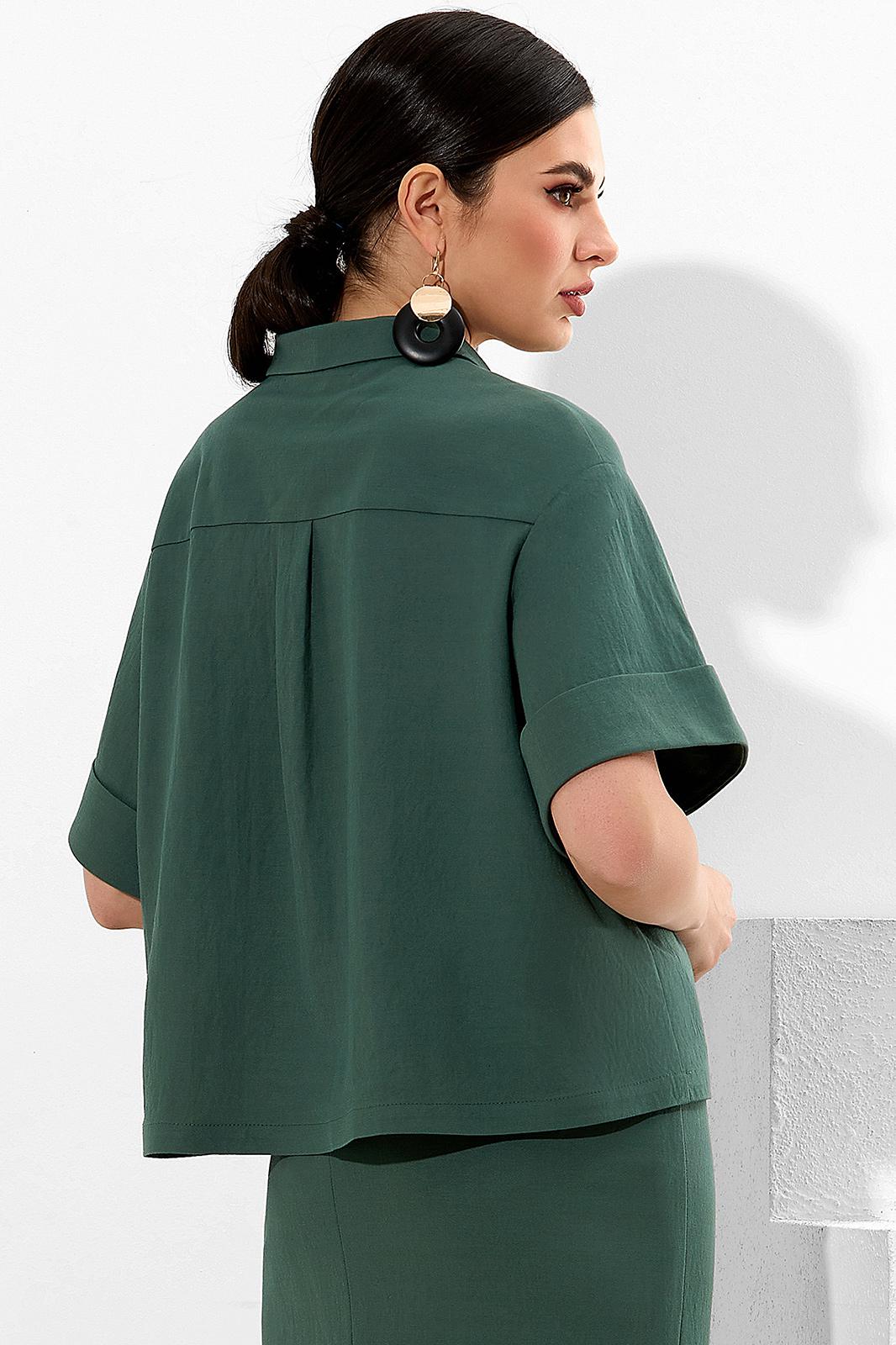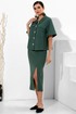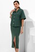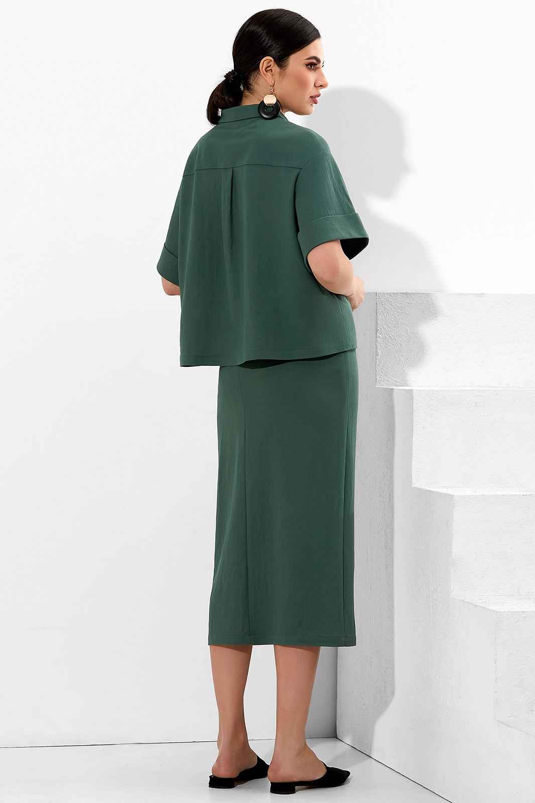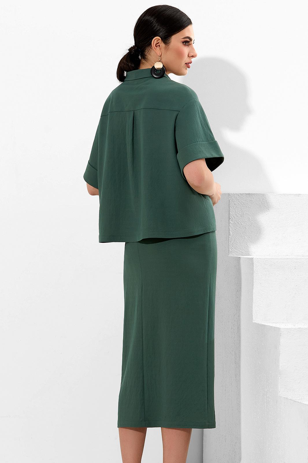 Блуза со стояче-отложным воротником и центральной застёжкой на петли и пуговицы. Перед с накладными карманами с клапанами в верхней части. Спинка с отрезной кокеткой и складкой от неё. Рукава втачные с отворотами по низу. Юбка с разрезом по переднему полотнищу. Заднее полотнище с потайной молнией в среднем шве. Юбка на подкладке.