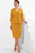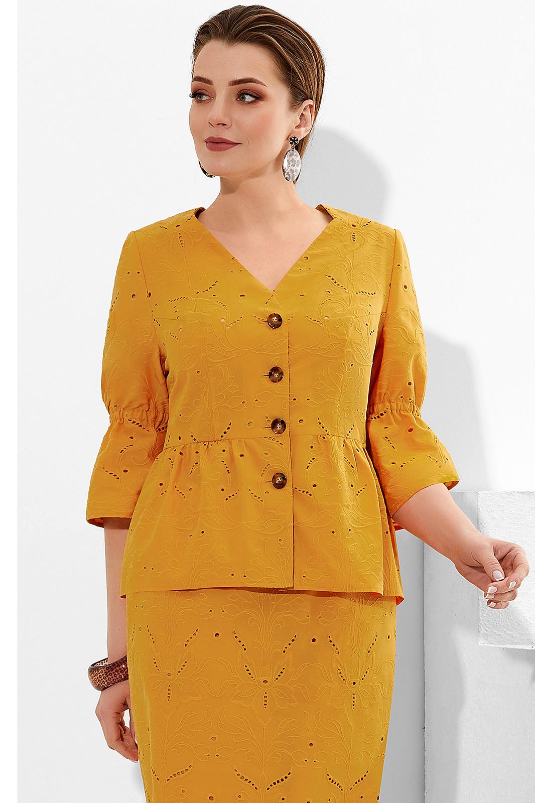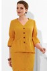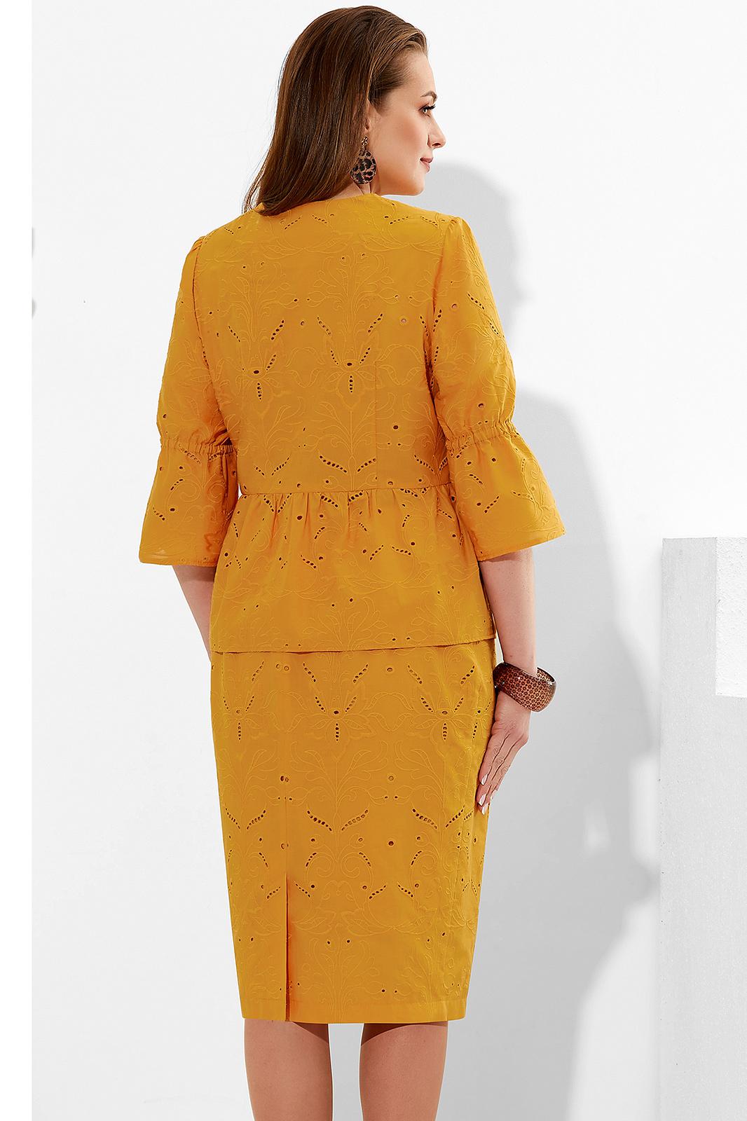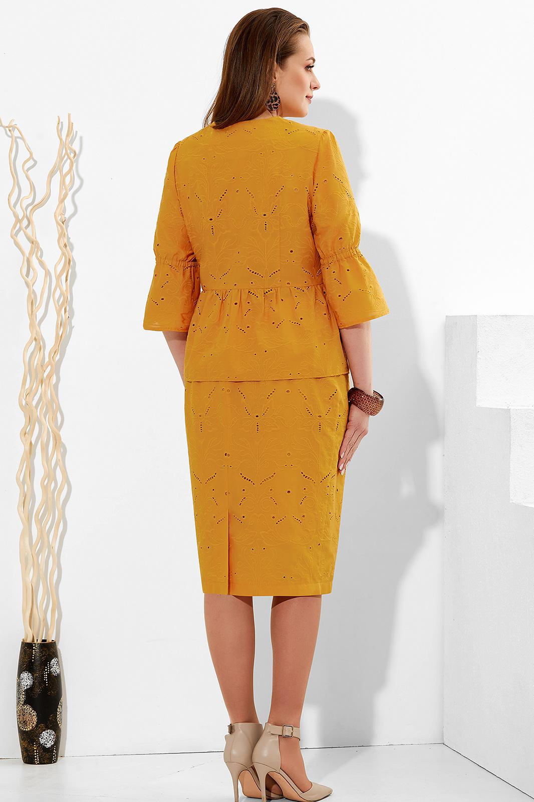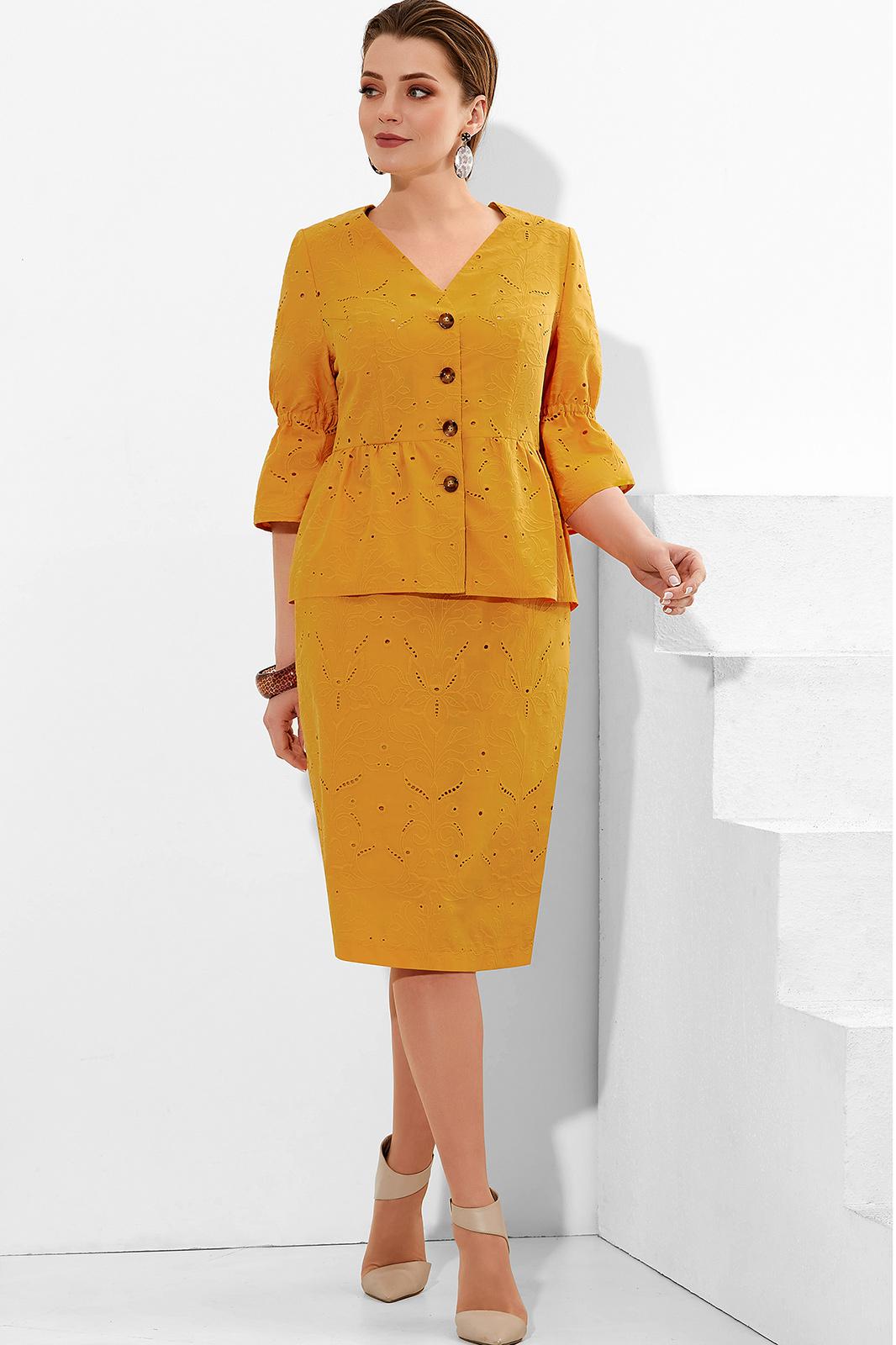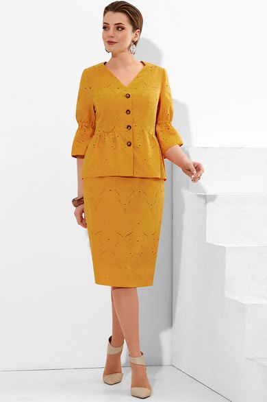 Жакет с фигурным вырезом горловины, отрезной баской и центральной застёжкой на петли и пуговицы. Спинка с талиевыми вытачками. Рукава втачные с резинкой и манжетой - рюшем по низу. Юбка на поясе. Заднее полотнище с потайной молнией и шлицей в среднем шве. Юбка на подкладке.
