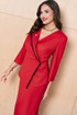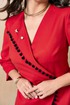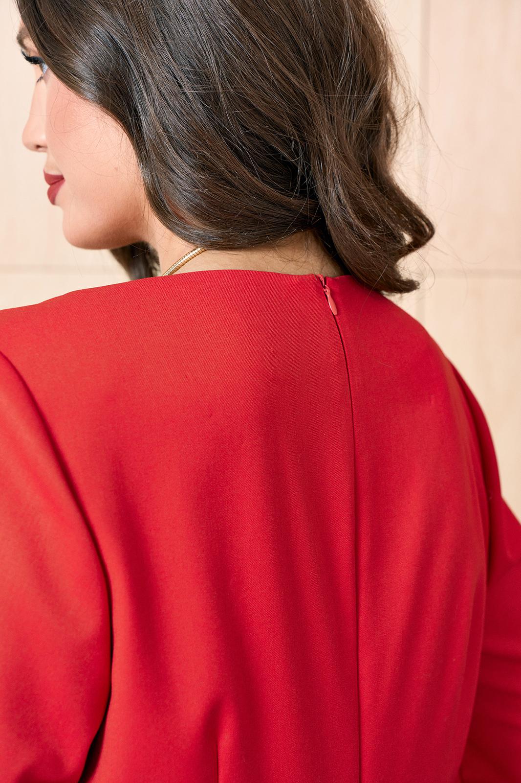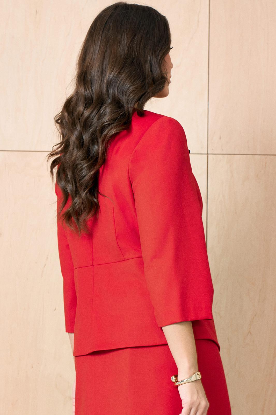 Блуза с V- образным вырезом горловины, фигурным низом и баской. Перед с брошью на лацкане и пришивным декором по краю. Спинка с потайной молнией в среднем шве и талиевыми вытачками до баски. Рукава втачные.