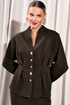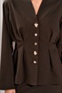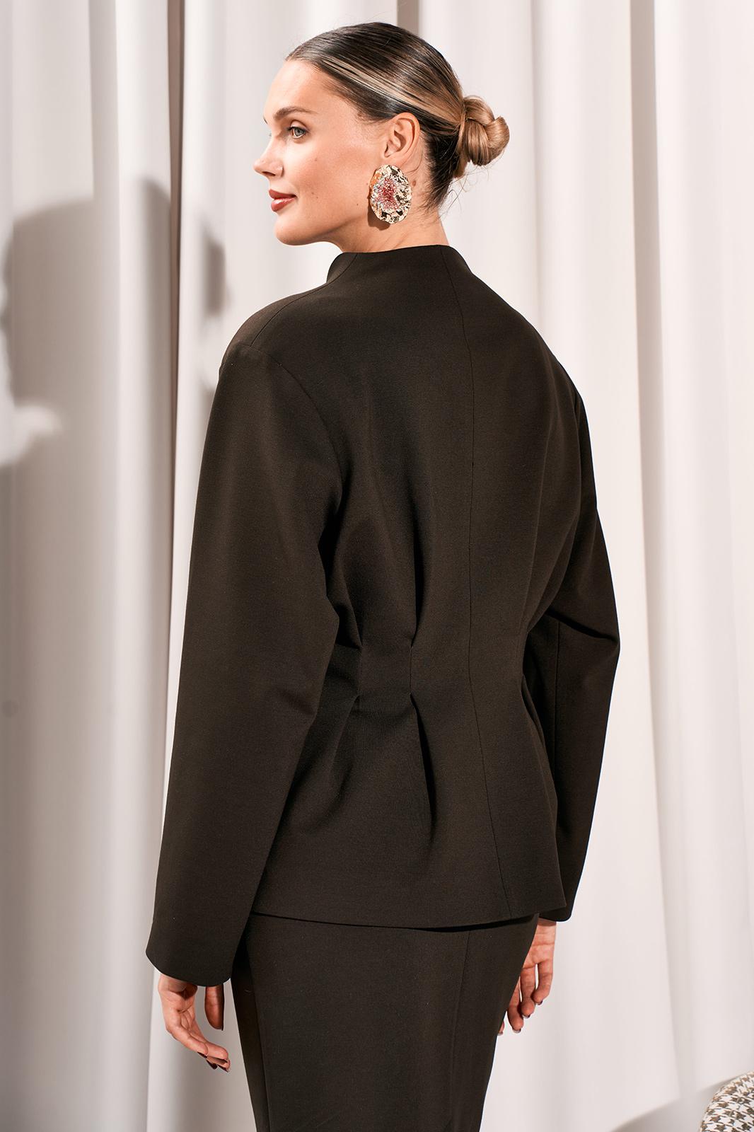 Жакет имеет современный силуэт: чуть расширенная линия плеча и более облегающий в районе талии. Изделие с цельнокроеной стойкой. По переду и спинке жакет застрочен по талии. Спинка со средним швом. Акцент изделия - это дизайнерские пуговицы. Каждая пуговица имеет свой оригинальный вид, объединяясь золотым цветом, создаётся современное уникальное сочетание. Рукава втачные. Жакет на подкладке.