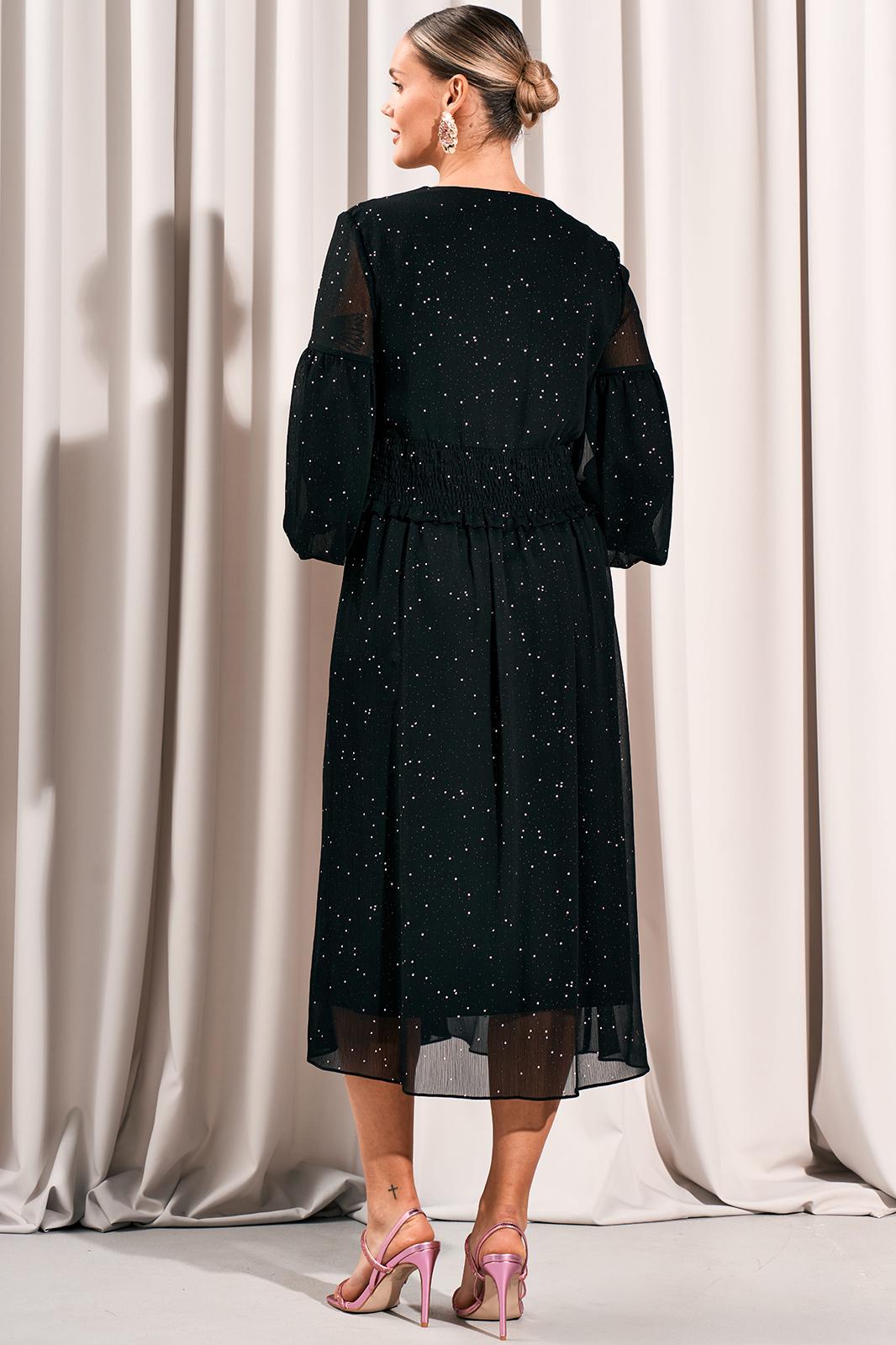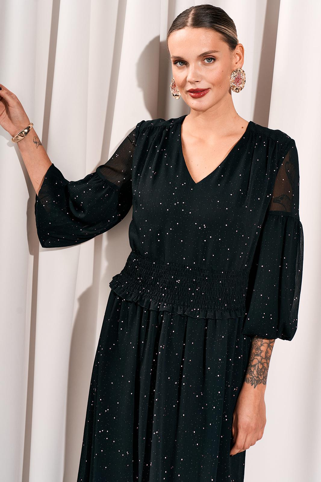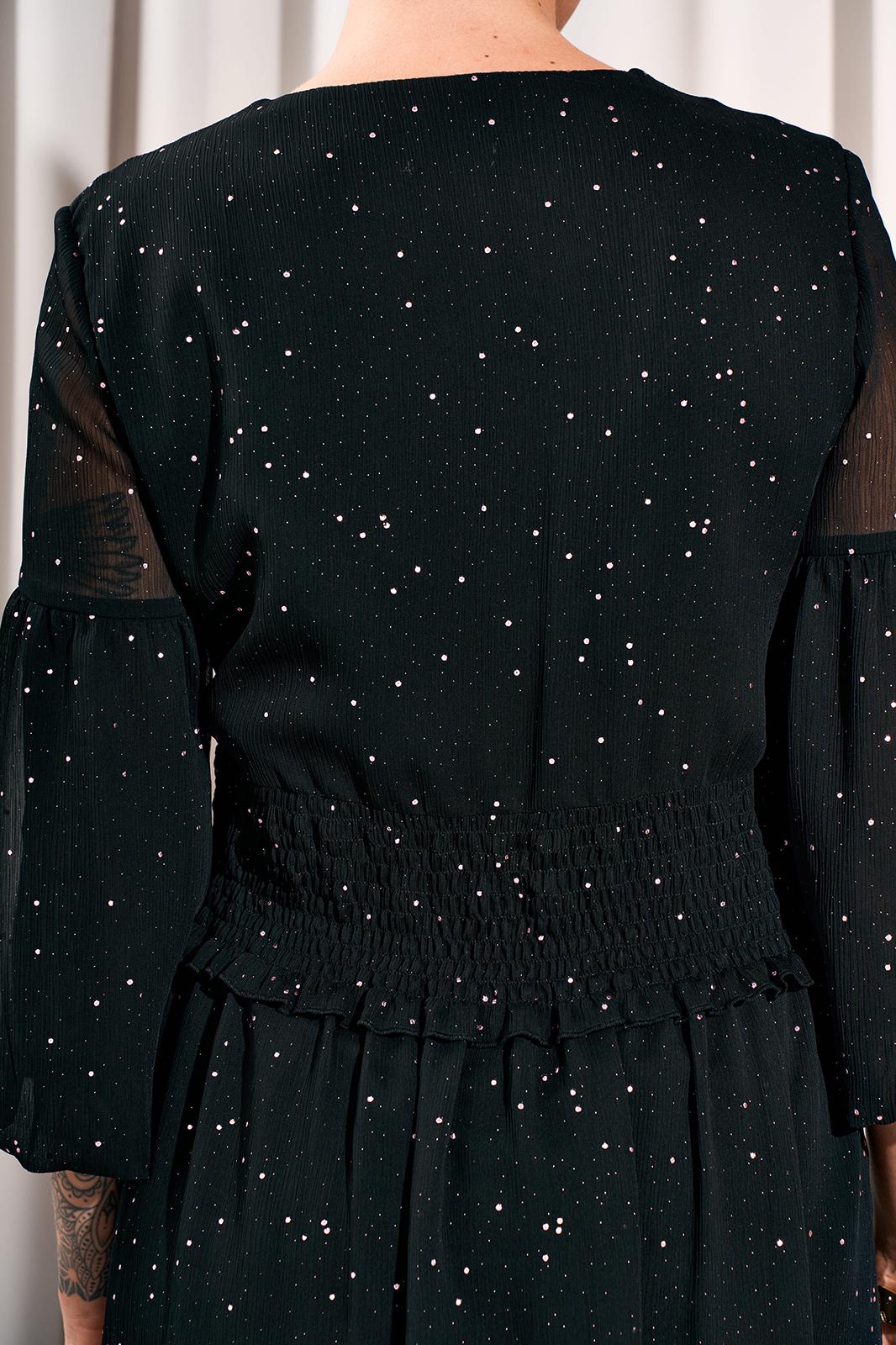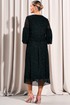 Платье с V- образным вырезом горловины и отрезной деталью собранной на венгерку по талии. Перед с кокеткой. Рукава втачные, состоящие из двух частей. Нижняя часть со сборкой и на подкладке. Платье на отлетной по низу подкладке.