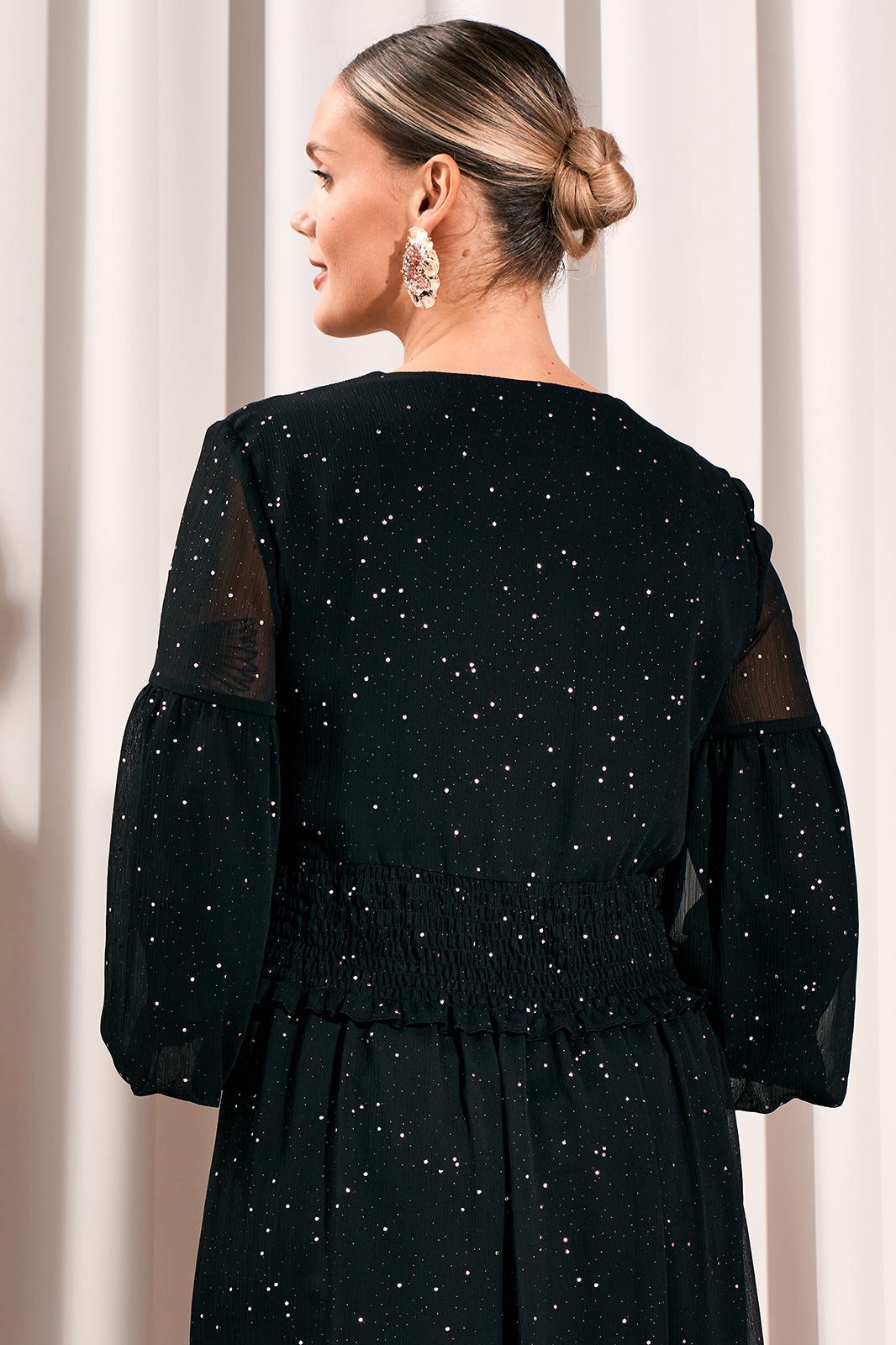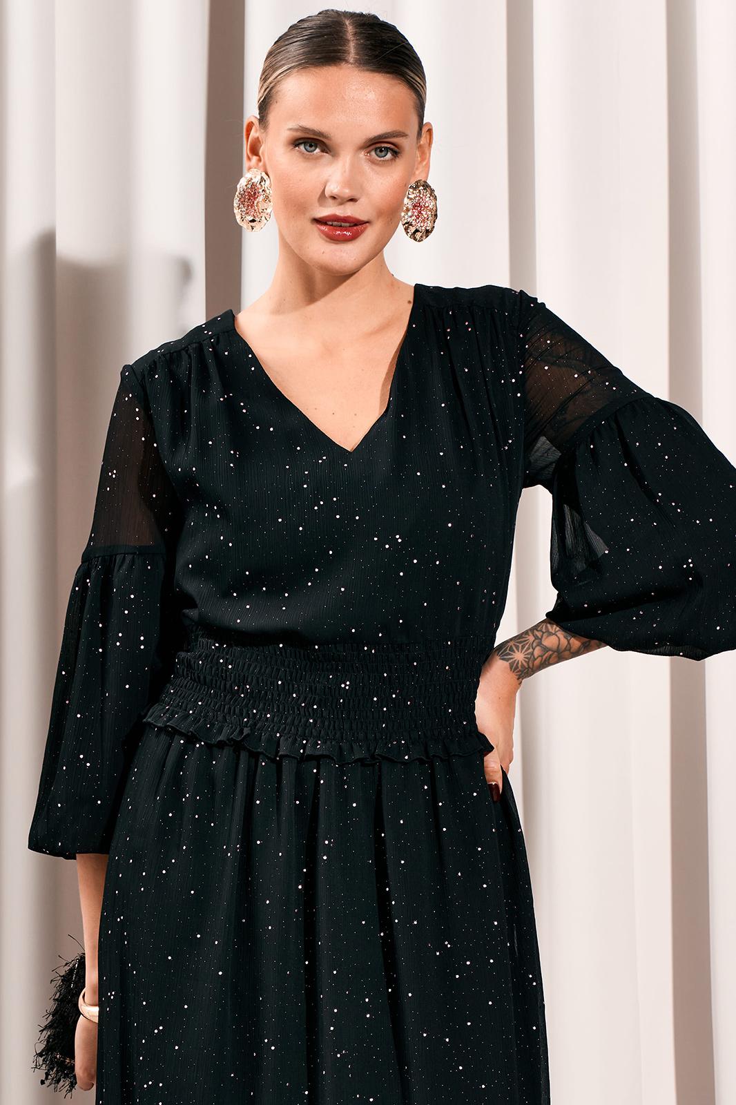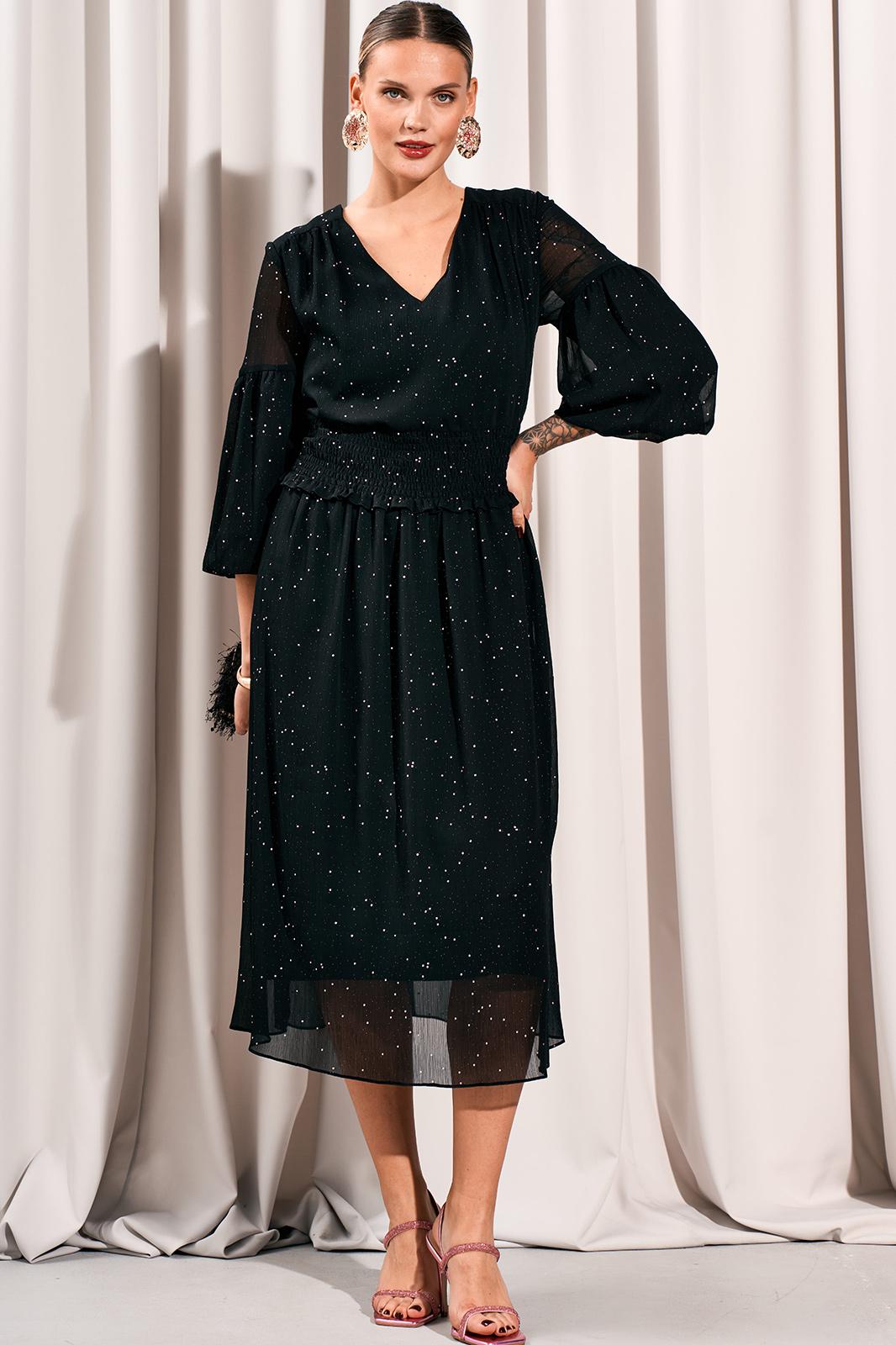 Платье с V- образным вырезом горловины и отрезной деталью собранной на венгерку по талии. Перед с кокеткой. Рукава втачные, состоящие из двух частей. Нижняя часть со сборкой и на подкладке. Платье на отлетной по низу подкладке.