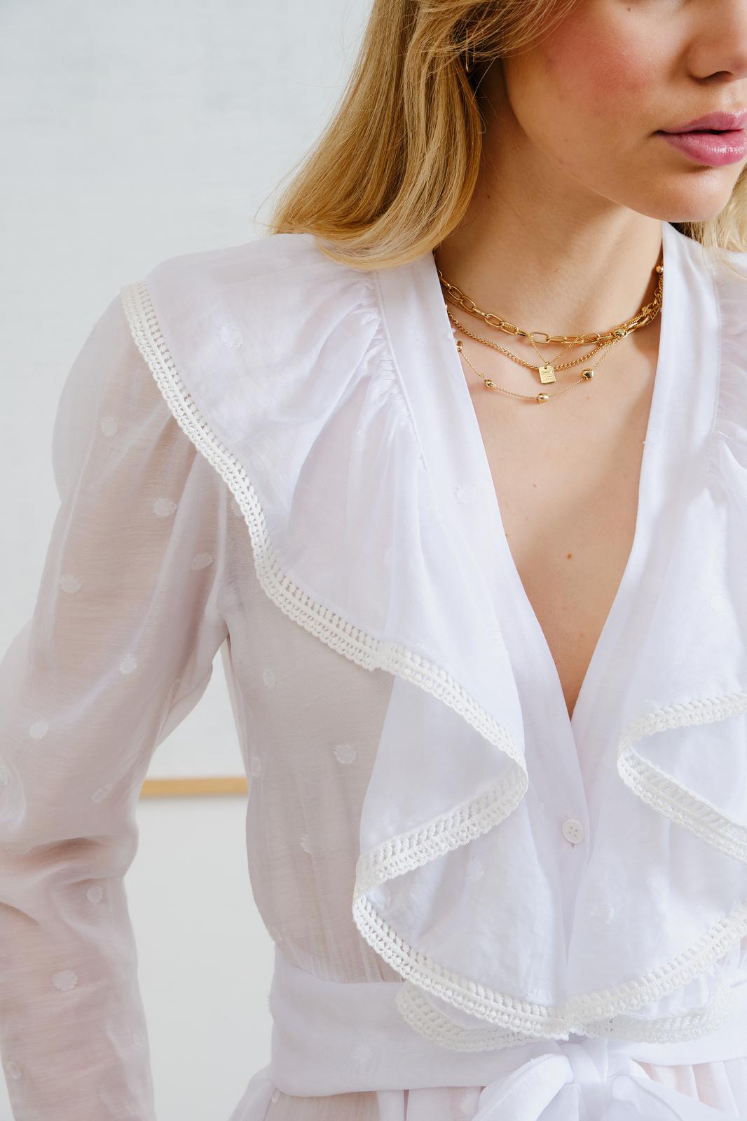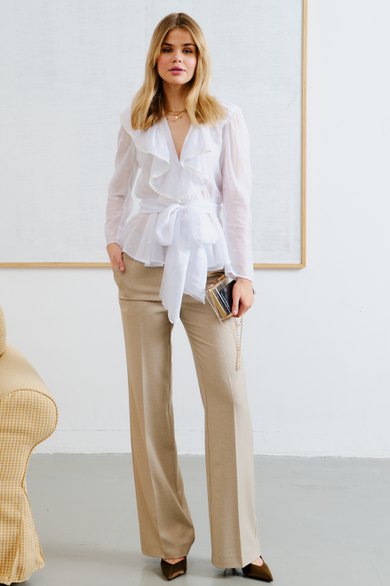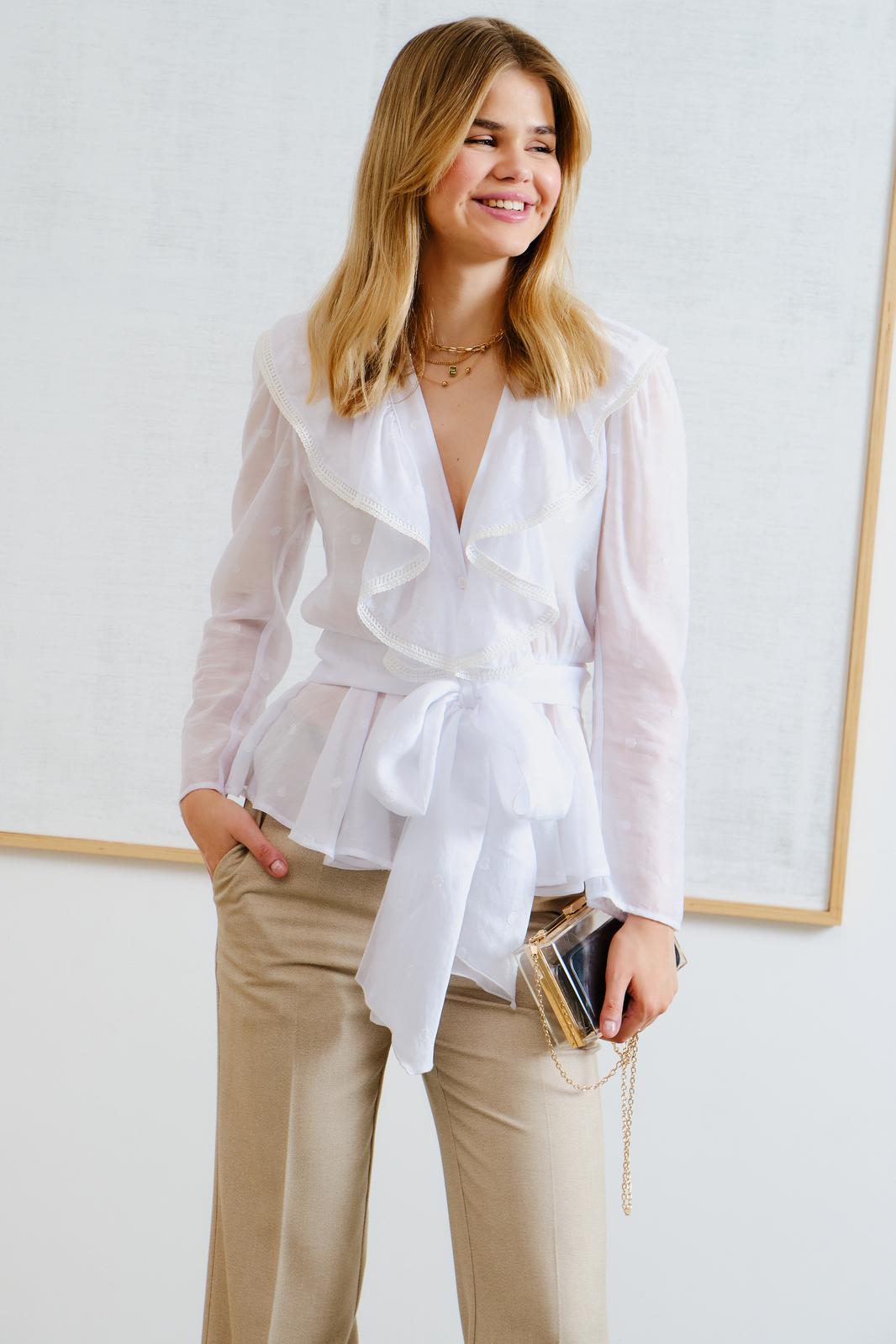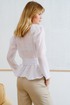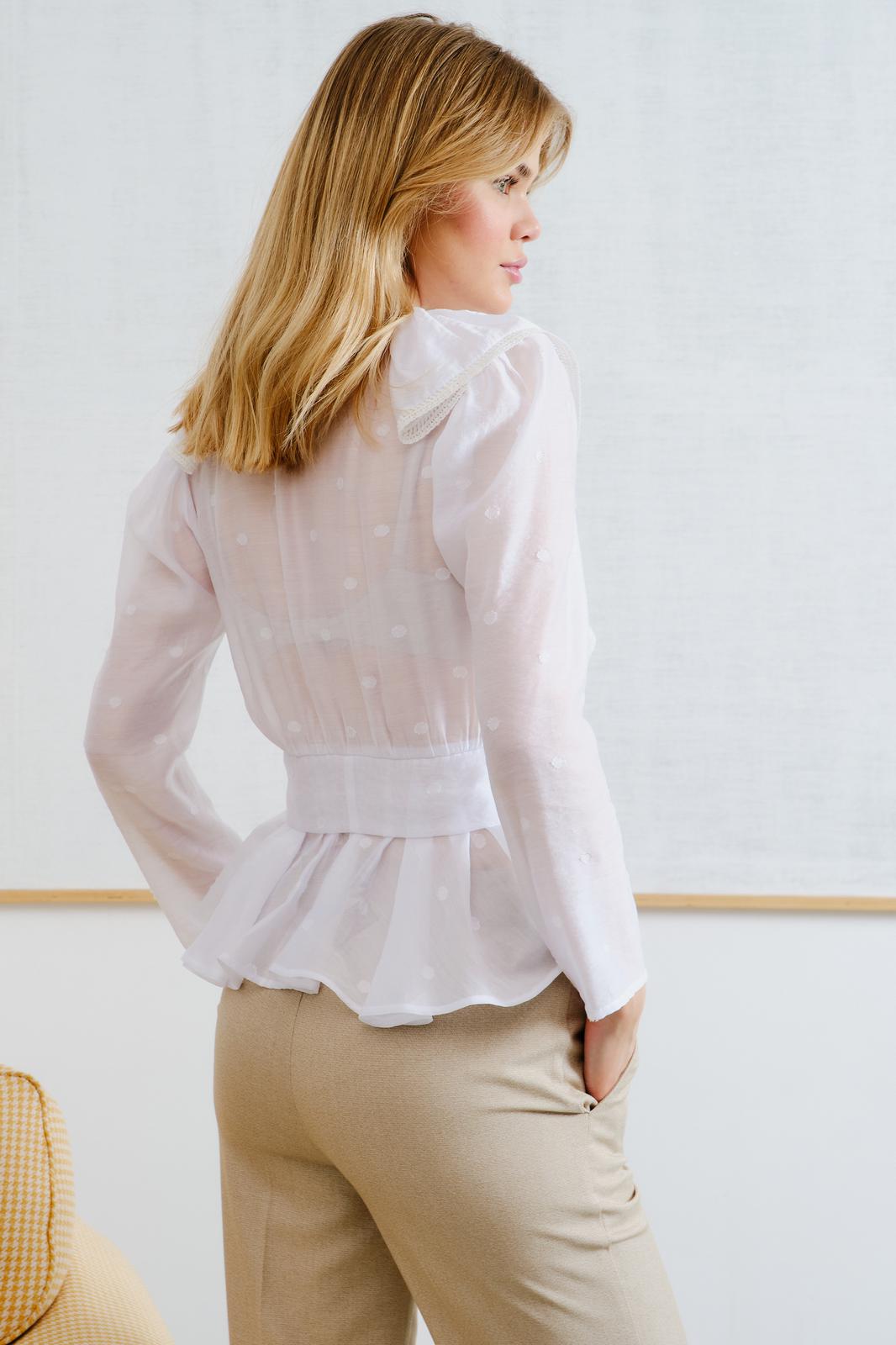 Блуза полуприлегающего силуэта, выполнена из нежной вискозы, дизайнгорох. Рукав втачной, длинный, по верхней части рукава сборка. По переду притачная планка с воланом, по отлету волана вшито кружевная тесьма. У-образный вырез горловины, застёжка центральная на петли и пуговицы. Линия талии отрезная, в шов подреза вшит отлетной пояс. Нижняя часть блуза- "баска", по талии собрана на сборку.
