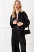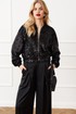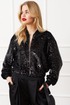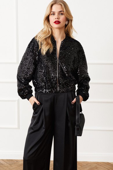 Жакет свободного кроя на трикотажной подкладке, застёжка на молнию, по рукавам и горловине довязы, низ собран на широкую резинку.