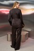 Костюм состоит из блузы и брюк. Блуза полуприлегающего силуэта, ассиметричная с драпировкой, на запах и завязкой сбоку. Рукав длинный втачной. На спинке средний шов и вытачки. Брюки на притачном поясе с резинкой по спинке, застёжка на молнию и петлю-пуговицу. В боковых швах прорезные карманы.