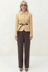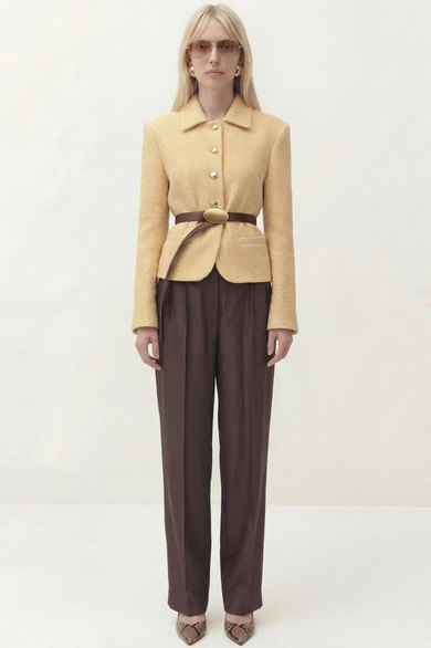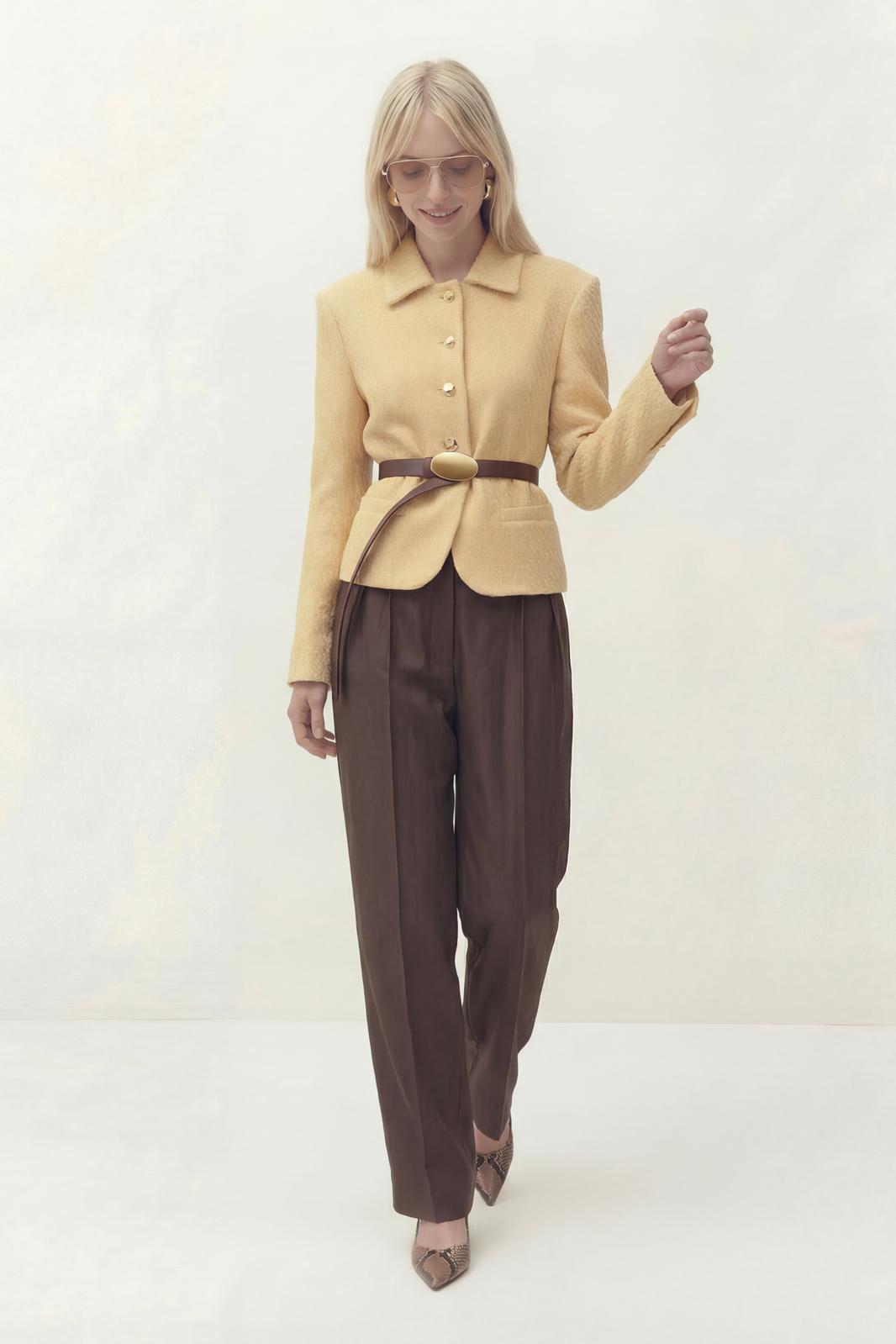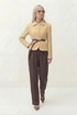 Жакет полуприлегающего силуэта с центральной застежкой на петли и пуговицы. Край борта фигурной формы. Рукав втачной длинный со шлицей. На шлице рукава пуговица. Воротник рубашечного кроя. По спинке средний шов и рельефы. Брюки свободного кроя, прямого силуэта, на притачном поясе. По переду глубокие складки, в боковых швах прорезные карманы. По задней половине брюк талевые вытачки. К комплекту прилагается съемный пояс коричневого цвета.