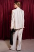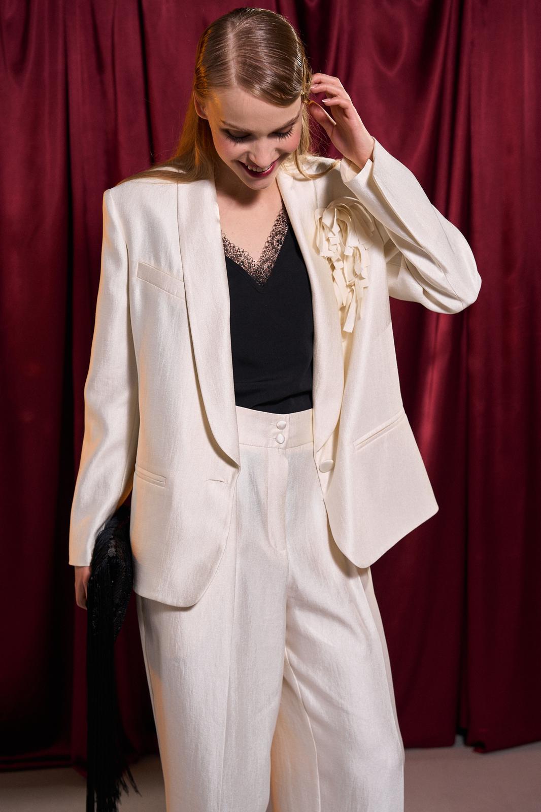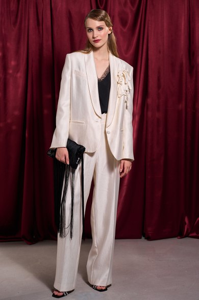 Костюм тройка, состоит из жакета, брюк и топа. Жакет свободного кроя, прямого силуэта на подкладке. Рукав длинный втачной, по локтевому шву шлица. Воротник шалька, центральная застежка на петли и пуговицы. По бокам прорезные карманы с клапаном. По спинке средний шов, переходящий в отлетную шлицу. Топ прямого силуэта, выполнен из блузочной ткани. По переду надстрочное кружево. Топ на регулируемых бретелях.
