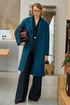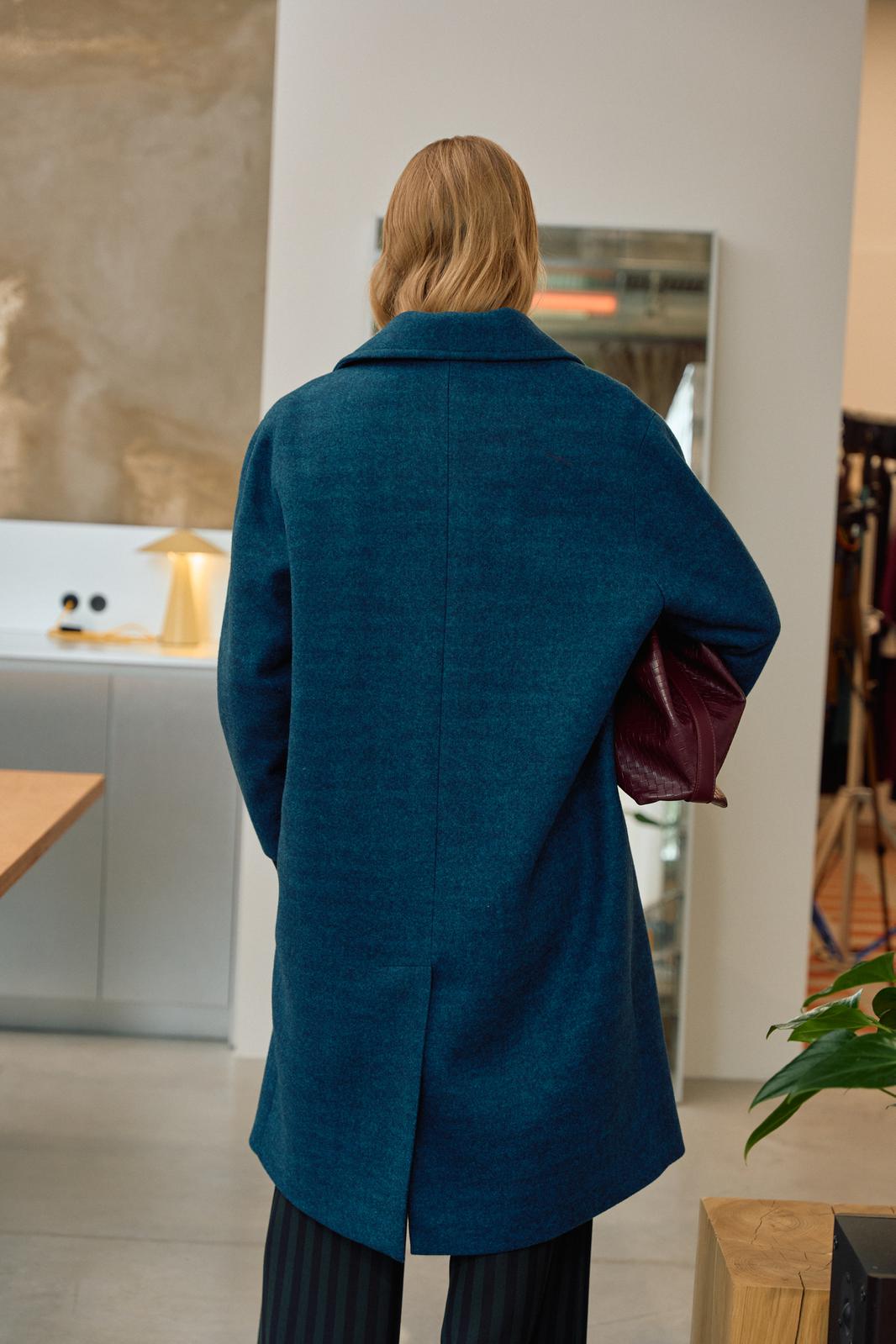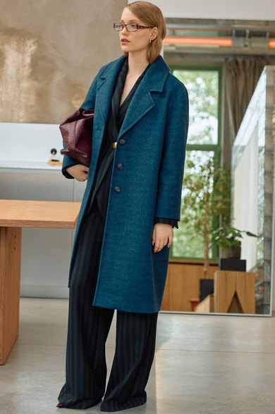 Пальто свободного кроя на подкладке. Линия плеча спущена, рукав длинный. Воротник пиджачного типа, застежка центральная на петли и пуговицы, в боковых швах карманы.