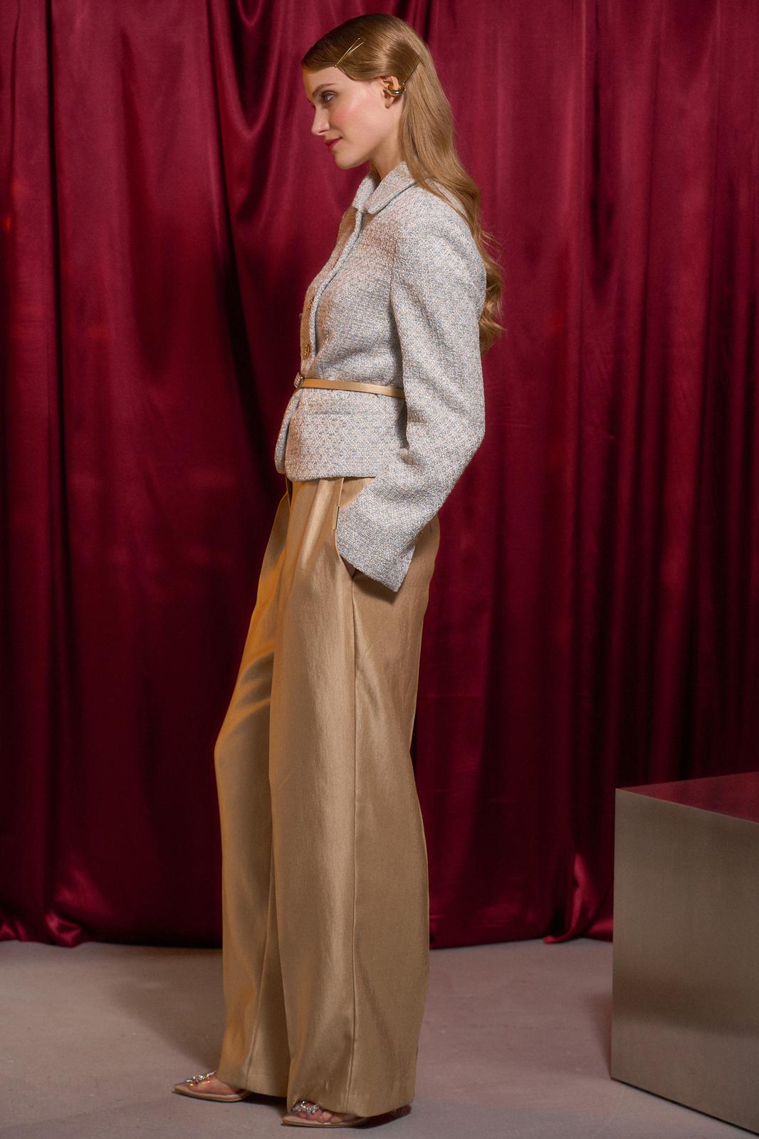Жакет полуприлегающего силуэта с центральной застежкой на петли и пуговицы. Край борта фигурной формы. Рукав втачной длинный со шлицей. На шлице рукава пуговица. Воротник рубашечного кроя. По спинке средний шов и рельефы.